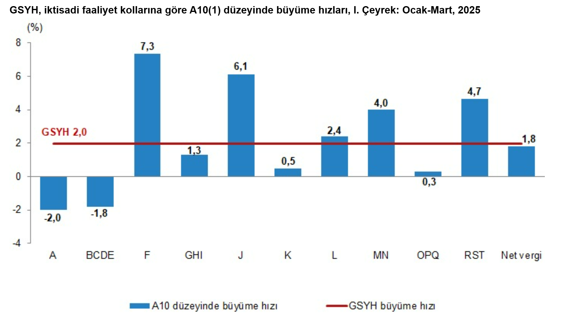 Türkiye İstatistik Kurumu (TÜİK), 2025 yılının ilk çeyreğine ilişkin Gayrisafi Yurt içi Hasıla verilerini açıkladı. TÜİK’in açıkladığı verilere göre ekonomi ilk çeyrekte yıllık bazda yüzde 2 büyüme kaydetti. Bu döneme ilişkin piyasaların genel beklentisi ise büyümenin yüzde 2,3 seviyesinde gerçekleşmesi yönündeydi. AA Finans'ın anket sonuçları ise ekonomistlerin bu yılın ilk çeyreğinde Türkiye ekonomisinin yıllık bazda yüzde 2,17 büyümesini beklediğini göstermişti. Ankete katılan ekonomistlerin beklentileri, yüzde 1,5 ile yüzde 3,2 aralığında yer almıştı. Türkiye ekonomisi, 2024'ün ilk çeyreğinde yüzde 5,4, son çeyreğinde ise yüzde 3 büyüme kaydetmişti. İlk çeyreğe ilişkin GSYH'yi oluşturan faaliyetler incelendiğinde; 2025 yılı birinci çeyreğinde bir önceki yıla göre zincirlenmiş hacim endeksi olarak; inşaat sektörü toplam katma değeri %7,3, bilgi ve iletişim faaliyetleri %6,1, diğer hizmet faaliyetleri %4,7, mesleki, idari ve destek hizmet faaliyetleri %4,0, gayrimenkul faaliyetleri %2,4, ürün üzerindeki vergiler eksi sübvansiyonlar %1,8, hizmetler %1,3, finans ve sigorta faaliyetleri %0,5 ve kamu yönetimi, eğitim, insan sağlığı ve sosyal hizmet faaliyetleri %0,3 arttı. Tarım sektörü %2,0, sanayi ise %1,8 azaldı. Kaynak: TÜİK - (1) A-Tarım, ormancılık ve balıkçılık, BCDE-Sanayi, F-İnşaat, GHI-Hizmetler, J-Bilgi ve iletişim, K-Finans ve sigorta faaliyetleri, L-Gayrimenkul faaliyetleri, MN-Mesleki, idari ve destek hizmet faaliyetleri, OPQ-Kamu yönetimi, eğitim, insan sağlığı ve sosyal hizmet faaliyetleri, RST-Diğer hizmet faaliyetleri. Mevsim ve takvim etkilerinden arındırılmış GSYH zincirlenmiş hacim endeksi, bir önceki çeyreğe göre %1,0 arttı. Takvim etkisinden arındırılmış GSYH zincirlenmiş hacim endeksi, 2025 yılının birinci çeyreğinde bir önceki yılın aynı çeyreğine göre %2,7 arttı. GSYH 2025 yılının ilk çeyreğinde cari fiyatlarla 12,125 trilyon TL oldu Üretim yöntemiyle Gayrisafi Yurt İçi Hasıla tahmini, 2025 yılının birinci çeyreğinde cari fiyatlarla bir önceki yılın aynı çeyreğine göre %36,7 artarak 12 trilyon 125 milyar 173 milyon TL oldu. GSYH'nin birinci çeyrek değeri cari fiyatlarla ABD doları bazında 335 milyar 504 milyon olarak gerçekleşti. Hanehalkı nihai tüketim harcamaları %2,0 arttı Yerleşik hanehalklarının nihai tüketim harcamaları 2025 yılının birinci çeyreğinde bir önceki yılın aynı çeyreğine göre zincirlenmiş hacim endeksi olarak %2,0 arttı. Devletin nihai tüketim harcamaları %1,2, gayrisafi sabit sermaye oluşumu ise %2,1 arttı. Mal ve hizmet ihracatı, 2025 yılının birinci çeyreğinde bir önceki yılın aynı çeyreğine göre zincirlenmiş hacim endeksi olarak %0,01 azalırken ithalatı %3,0 arttı. İşgücü ödemeleri, 2025 yılının birinci çeyreğinde bir önceki yılın aynı çeyreğine göre %42,9 arttı. Net işletme artığı/karma gelir %31,2 arttı. İşgücü ödemelerinin cari fiyatlarla Gayrisafi Katma Değer içerisindeki payı geçen yılın birinci çeyreğinde %41,7 iken, bu oran 2025 yılı birinci çeyreğinde %43,7 oldu. Net işletme artığı/karma gelirin payı ise geçen yılın birinci çeyreğinde %36,4 iken, 2025 yılı birinci çeyreğinde %35,0 oldu. [news_id:773602]