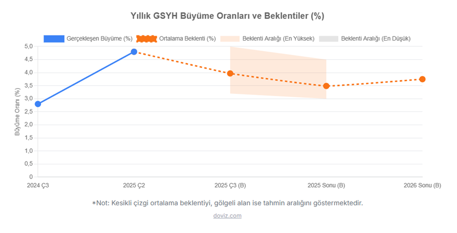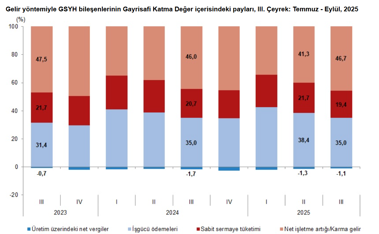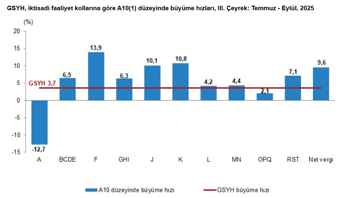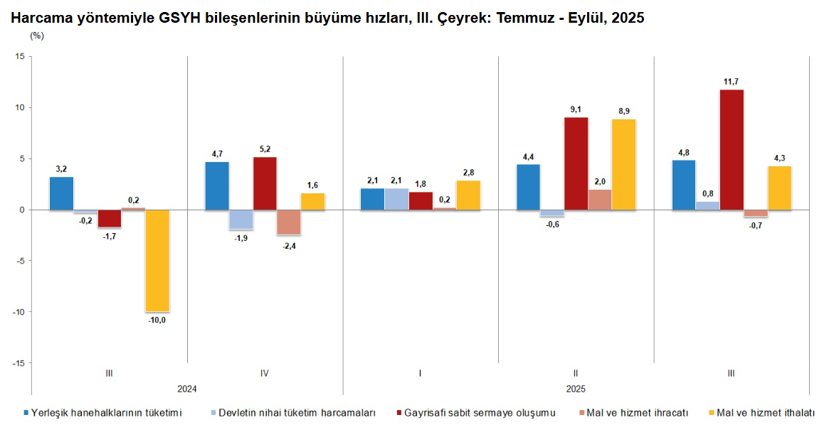 Türkiye İstatistik Kurumu (TÜİK), 2025 yılının üçüncü çeyreğine ilişkin Gayrisafi Yurt içi Hasıla verilerini açıkladı. TÜİK’in açıkladığı verilere göre ekonomi üçüncü çeyrekte yıllık bazda %3,7 büyüme kaydetti. AA Finans'ın anket sonuçlarına göre ekonomistler, bu yılın üçüncü çeyreğinde Türkiye ekonomisinin %3,97 büyüdüğünü tahmin etmişti. Ankete katılan ekonomistlerin beklentileri %3,20 ile %5 aralığında yer almıştı. Türkiye ekonomisi, 2024'ün üçüncü çeyreğinde yüzde 2,8, 2025 yılının ikinci çeyreğinde ise yüzde 4,8 büyüme gerçekleştirmişti. GSYH'yi oluşturan faaliyetler incelendiğinde; 2025 yılı üçüncü çeyreğinde bir önceki yıla göre zincirlenmiş hacim endeksi olarak; inşaat %13,9, finans ve sigorta faaliyetleri %10,8, bilgi ve iletişim faaliyetleri %10,1, ürün üzerindeki vergiler eksi sübvansiyonlar %9,6, diğer hizmet faaliyetleri %7,1, sanayi sektörü %6,5, ticaret, ulaştırma, konaklama ve yiyecek hizmetleri %6,3, mesleki, idari ve destek hizmet faaliyetleri %4,4, gayrimenkul faaliyetleri %4,2, kamu yönetimi, eğitim, insan sağlığı ve sosyal hizmet faaliyetleri %2,1 arttı. Tarım sektörü ise %12,7 azaldı. Mevsim ve takvim etkilerinden arındırılmış GSYH zincirlenmiş hacim endeksi, bir önceki çeyreğe göre %1,1 arttı. Takvim etkisinden arındırılmış GSYH zincirlenmiş hacim endeksi, 2025 yılı üçüncü çeyreğinde bir önceki yılın aynı çeyreğine göre %3,4 arttı. Üretim yöntemiyle Gayrisafi Yurt İçi Hasıla tahmini, 2025 yılının üçüncü çeyreğinde cari fiyatlarla bir önceki yılın aynı çeyreğine göre %41,6 artarak 17 trilyon 424 milyar 718 milyon TL oldu. GSYH'nin üçüncü çeyrek değeri cari fiyatlarla ABD doları bazında 432 milyar 880 milyon olarak gerçekleşti. Hanehalkı nihai tüketim harcamaları %4,8 arttı Yerleşik hanehalklarının nihai tüketim harcamaları 2025 yılının üçüncü çeyreğinde bir önceki yılın aynı çeyreğine göre zincirlenmiş hacim endeksi olarak %4,8 arttı. Devletin nihai tüketim harcamaları %0,8, gayrisafi sabit sermaye oluşumu ise %11,7 arttı. Mal ve hizmet ihracatı, 2025 yılının üçüncü çeyreğinde bir önceki yılın aynı çeyreğine göre zincirlenmiş hacim endeksi olarak %0,7 azalırken ithalatı %4,3 arttı. İşgücü ödemeleri %41,1 arttı İşgücü ödemeleri, 2025 yılının üçüncü çeyreğinde bir önceki yılın aynı çeyreğine göre %41,1 arttı. Net işletme artığı/karma gelir %43,5 arttı. İşgücü ödemelerinin cari fiyatlarla Gayrisafi Katma Değer içerisindeki payı geçen yılın üçüncü çeyreğinde %35,0 iken, bu oran 2025 yılında da %35,0 oldu. Net işletme artığı/karma gelirin payı ise %46,0 iken %46,7 oldu. [news_id:787268]