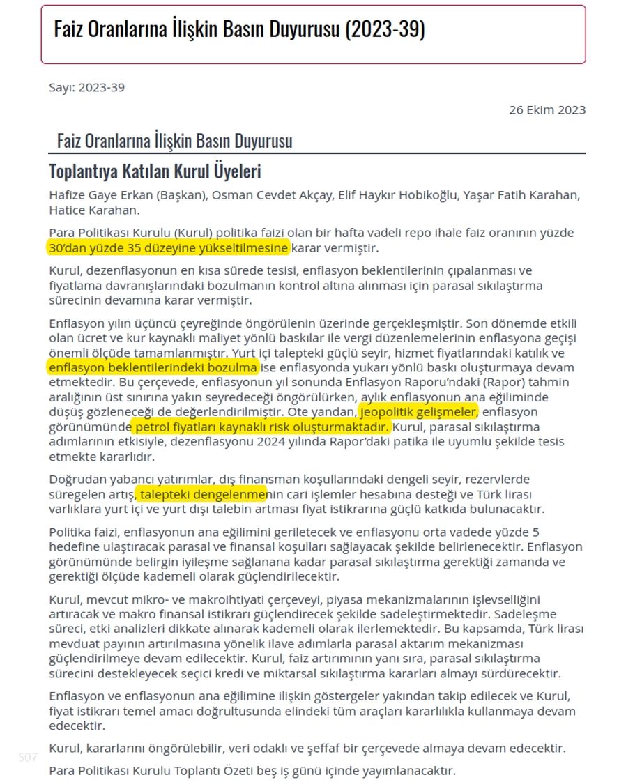 TCMB'nin 500 baz puanlık faiz kararının ardından ekonomistlerden de karara ilişkin değerlendirmeler gelmeye başladı. İşte ekonomistlerin faiz kararına ilişkin ilk yorumları.. Ekim ayı olağan toplantısını gerçekleştiren Para Politikası Kurulu, politika faizini 5 puan artırarak yüzde 35'e çıkardı. [news_id:712390] Eski Hazine Müsteşarı Mahfi Eğilmez ise konuyla ilgili açıklamasında, “İlke olarak irrasyonellikten rasyonelliğe geçişte faizin böyle tedrici artırılması doğru ama beklentilerin olumlu yönde gelişmesi için bu kararın yapısal reformlarla desteklenmesi lazım.” ifadelerini kullandı. Ekonomist Atilla Yeşilada da, TCMB’nin faiz kararının cesur bir hamle olduğunu belirterek, “Cesur bir hamle, dövize fren, Borsa'ya destek derim.” değerlendirmesinde bulundu. TCMB’nin Hafize Gaye Erkan başkanlığındaki 5. faiz artışına yönelik diğer ekonomistlerin görüşleri ise şöyle sıralandı: İris Cibre "Kurul, dezenflasyonun en kısa sürede tesisi, enflasyon beklentilerinin çıpalanması ve fiyatlama davranışlarındaki bozulmanın kontrol altına alınması için parasal sıkılaştırma sürecinin devamına karar vermiştir" Çok doğru cümleler. Enflasyonla savaşta gösterilen kararlılıkla ancak beklentiler çıpalanabilir." Murat Sagman "Merkez Bankası politika faizini beklentilerin büyük kısmına paralel 500 baz puan artırdı. Politika faizi yüzde 35 oldu. Yıl sonu yüzde 40 politika faizi beklentimi koruyorum." Hayri Kozanoğlu "TCMB enflasyon ile ekonomik durgunluk arasında sıkışmıştı. 500 puanlık artışla tercihini ekonomide durgunluktan yana yaptı. Metinden 2 Kasım Enflasyon Raporu’nda 2024 yılı %33 enflasyon hedefinin korunacağı anlaşılıyor. Özellikle KK ve bireysel kredi faizleri can yakacak." Güldem Atabay "PPK'dan doğru adım. Benim için net olmayan: Gerektiği zaman, kademeli faiz artışları devam mesajı var. Ücret/vergi artışlarının etkisinin tamamlandığı, beklenti ve hizmetlerle baskıların devam ettiği söyleniyor. Ben %3 5'te duracak, izleyecek diye anlıyorum.% 40-45'e yolu olsa da..." Ekonomi paylaşımları ile bilinen 507 ise konuya ilişkin sosyal medya hesabından şunları söyledi: Faiz %5 arttı ve bir önceki PPK ile benzer bir metin geldi. "Gelecek aylarda artık yavaşlar ve dururuz" anlamına gelen bir ima yok, trend devam. Eklenen/değişen kelime grupları: Kaynak: 507 - X