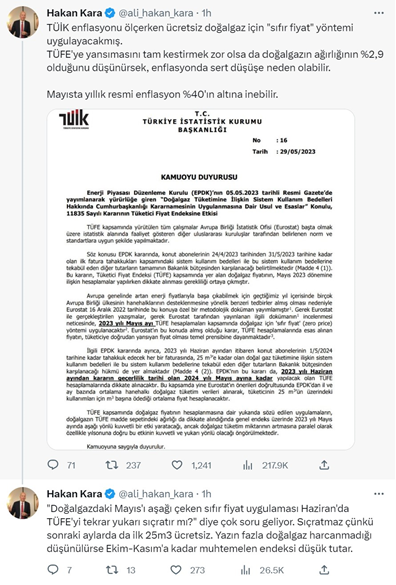 Ekonomistler, enflasyon hesaplamasında doğal gazın fiyatını sıfır olarak belirleyen TÜİK'in bu kararının TÜFE üzerindeki olası etkilerini değerlendirdi. TÜİK, 3 Haziran’da açıklanacak enflasyon verisinde doğal gazın veri üzerindeki etkisini “sıfır” olarak alma kararı aldığını açıkladı. Kararı sosyal medya hesabından değerlendiren TCMB Eski Başekonomisti Hakan Kara ise mayısta yıllık enflasyonun yüzde 40’ın altına inebileceğini öngördüğünü şu sözlerle duyurdu: “TÜİK enflasyonu ölçerken ücretsiz doğal gaz için “sıfır fiyat” yöntemi uygulayacakmış. TÜFE’ye yansımasını tam kestirmek zor olsa da doğal gazın ağırlığının yüzde 2,9 olduğunu düşünürsek, enflasyonda sert düşüşe neden olabilir. Mayısta yıllık resmi enflasyon yüzde 40’ın altına inebilir. Doğal gazdaki mayısı aşağı çeken sıfır fiyat uygulaması haziranda TÜFE'yi tekrar yukarı sıçratır mı?" diye çok soru geliyor. Sıçratmaz, çünkü sonraki aylarda da ilk 25m3 ücretsiz. Yazın fazla doğal gaz harcanmadığı düşünülürse Ekim-Kasım'a kadar muhtemelen endeksi düşük tutar.” Kaynak: Hakan Kara - Twitter Finans piyasaları uzmanı İris Cibre ise TÜİK'in doğal gaz kararının TÜFE üzerinde aylık etkisinin 2.88% olmasını beklediğini belirterek şunları kaydetti: "Doğal gaz kararı ile TÜFE'ye aylık etkisinin 2,88% negatif olmasını bekliyorum. Dolayısıyla Tüfe mayıs ayında +0,2% ile -0,5% arasında olabilir. -0,5% geldiği takdirde yıllık enflasyon 38,88% olacak bu da tüm ücret zamlarına yansıyacaktır." Tıklayın: Gözler asgari ücret zammında: Asgari ücreti belirleyecek iki önemli kriter Tıklayın: Doğal gaz hesaplamasında 'sıfır fiyat' yöntemi uygulanacak