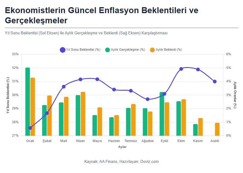 33 ekonomistin katılım sağladığı aralık ayı enflasyon beklenti anketi sonuçlandı. İşte ekonomistlerin enflasyonda son tahminleri.. Türkiye İstatistik Kurumu tarafından 5 Ocak Pazartesi günü açıklanacak olan aralık ayı enflasyon verileri öncesinde, 33 ekonomistin katılımıyla düzenlenen beklenti anketi sonuçlandı. Ankete katılan ekonomistlerin aralık ayı Tüketici Fiyat Endeksi artış beklentilerinin ortalaması yüzde 0,96 olarak hesaplandı. Ekonomistlerin tahminleri geniş bir yelpazede seyrederek en düşük yüzde 0,55 ile en yüksek yüzde 1,24 aralığında şekillendi. Ekonomistlerin paylaştığı yüzde 0,96'lık aylık ortalama artış beklentisi doğrultusunda, bir önceki ay yüzde 31,07 seviyesinde gerçekleşen yıllık enflasyonun aralık ayında yüzde 31 düzeyine gerileyeceği tahmin ediliyor. Bununla birlikte, katılımcıların 2026 yılı sonuna dair enflasyon beklentilerinin ortalaması aralık ayı itibarıyla yüzde 23,33 olarak kayıtlara geçti. Tüketici Fiyat Endeksi'nde kasım ayında yüzde 0,87 oranında bir yükseliş yaşanmıştı. 2025 yılı beklenti ve gerçekleşmeleri Yılın başından itibaren beklenti ve gerçekleşmeler ise şu şekilde sıralandı: Kaynak: AA Finans