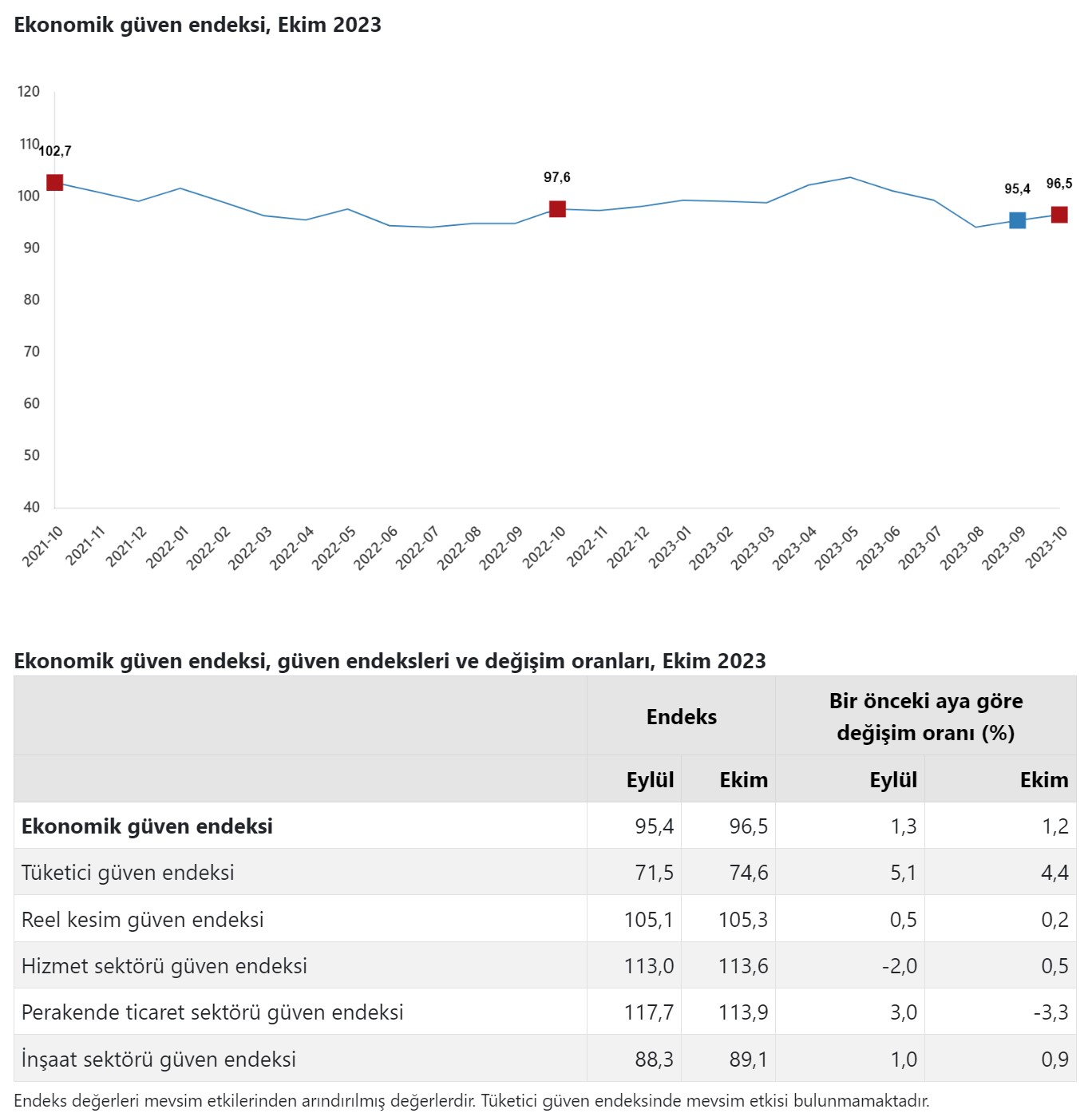 TÜİK verilerine göre Ekonomik Güven Endeksi ekim ayında %1,2 oranında artarak 96,5 değerini aldı. Türkiye İstatistik Kurumu ekim ayı Ekonomik Güven Endeksi rakamlarını paylaştı. Buna göre Ekonomik Güven Endeksi eylül ayında 95,4 iken, ekim ayında %1,2 oranında artarak 96,5 değerini aldı. TÜİK'ten yapılan açıklamaya göre, bir önceki aya göre ekim ayında tüketici güven endeksi %4,4 oranında artarak 74,6 değerini, reel kesim (imalat sanayi) güven endeksi %0,2 oranında artarak 105,3 değerini, hizmet sektörü güven endeksi %0,5 oranında artarak 113,6 değerini, perakende ticaret sektörü güven endeksi %3,3 oranında azalarak 113,9 değerini, inşaat sektörü güven endeksi %0,9 oranında artarak 89,1 değerini aldı. Kaynak: TÜİK