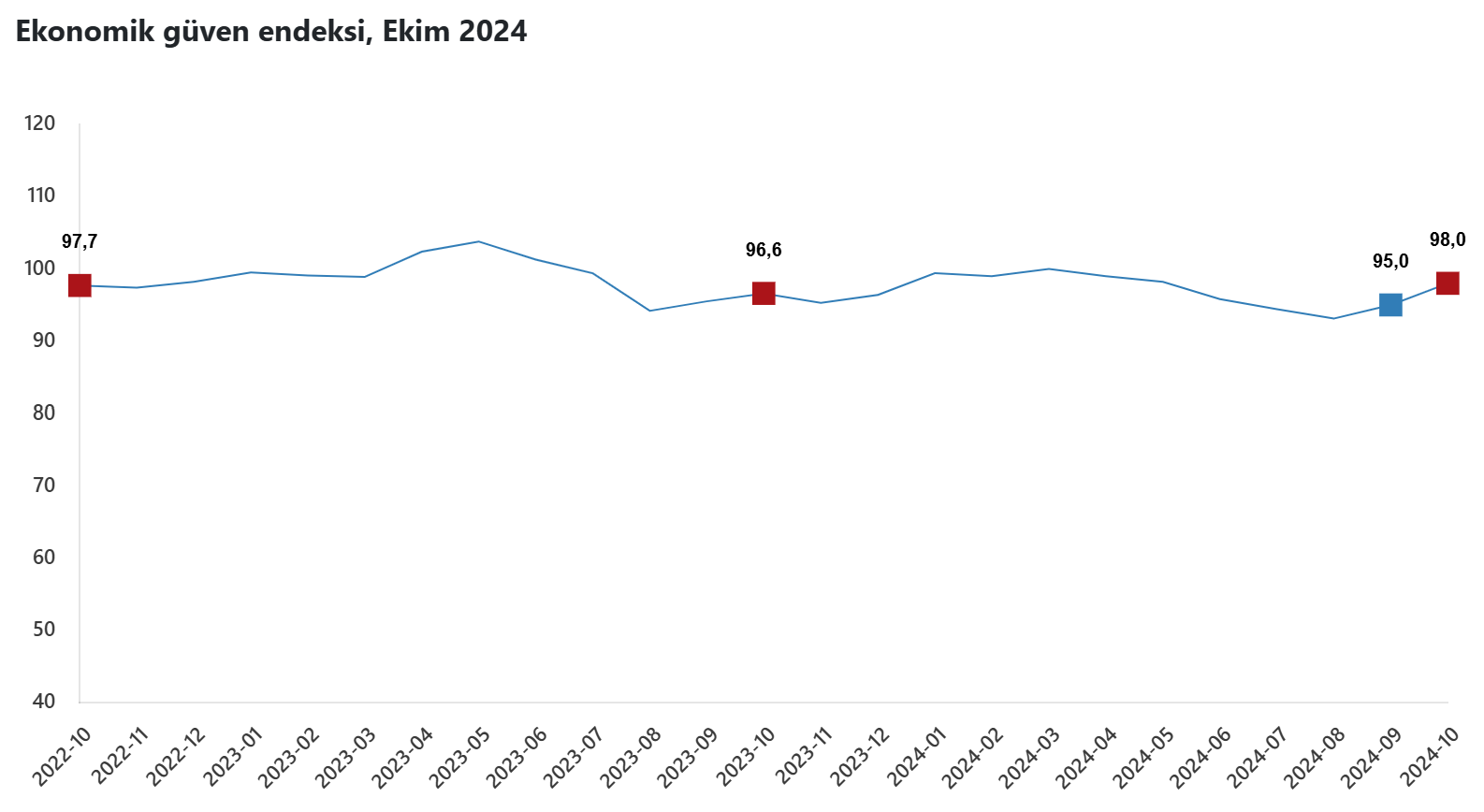 Ekonomik güven endeksi, ekim ayında aylık bazda yüzde 3,2 artarak 98 oldu. Türkiye İstatistik Kurumu (TÜİK), ekim ayına ilişkin ekonomik güven endeksi verilerini açıkladı. Buna göre, eylülde 95 olan endeks, ekimde yüzde 3,2 artarak 98'e yükseldi. Kaynak: TÜİK Aynı dönemde tüketici güven endeksi yüzde 3 artışla 80,6'ya çıktı. Reel kesim (imalat sanayisi) güven endeksi yüzde 3 yükselişle 102,2 oldu. Hizmet sektörü güven endeksi yüzde 1,5 artarak 114,2'ye, perakende ticaret sektörü güven endeksi yüzde 0,1 artışla 110,7'ye yükselirken, inşaat sektörü güven endeksi yüzde 1,7 azalışla 86,3 değerini aldı.