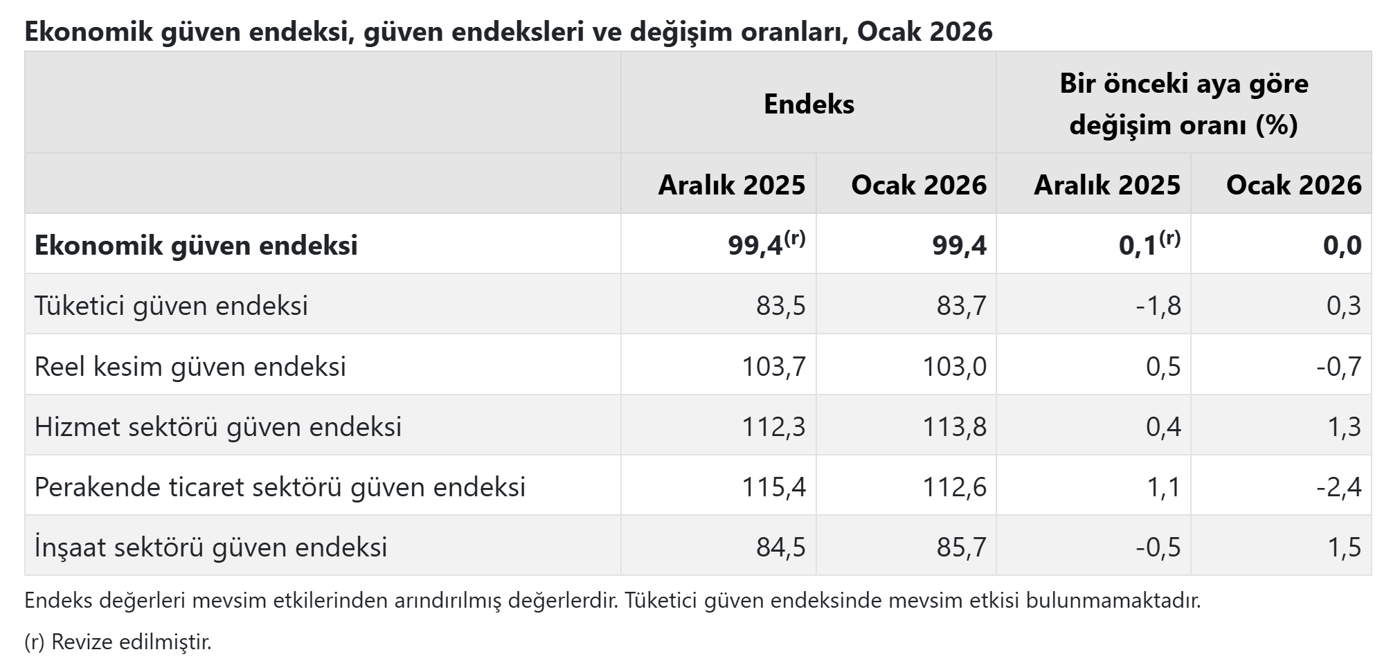 Ekonomik güven endeksi, ocakta aylık bazda değişim göstermeyerek 99,4 değerini aldı. Türkiye İstatistik Kurumu (TÜİK), ocak ayına ilişkin ekonomik güven endeksi verilerini açıkladı. TÜİK verilerine göre Aralık 2025'te 99,4 olan endeks, ocakta da aynı düzeyde kaldı. Tüketici güven endeksi ise ocakta aylık bazda yüzde 0,3 yükselerek 83,7'ye çıktı. Aynı dönemde reel kesim güven endeksi, yüzde 0,7 azalışla 103 olarak kayıtlara geçti. Hizmet sektörü güven endeksi de yüzde 1,3 yükselerek 113,8 oldu. Perakende ticaret sektörü güven endeksi, yüzde 2,4 azalışla 112,6'ya gerilerken inşaat sektörü güven endeksi ise yüzde 1,5 artarak 85,7 değerini aldı. TÜİK, bazı aylara ilişkin verilerde revizyona gitti. Kaynak: TÜİK