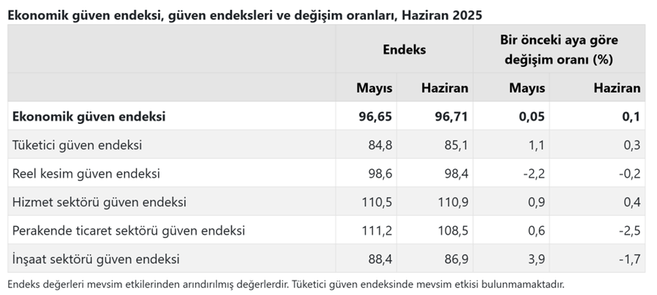 TÜİK verilerine göre ekonomik güven endeksi haziran ayında yüzde 0,1 artış kaydetti. Türkiye İstatistik Kurumu (TÜİK), haziran ayı ekonomik güven endeksi verilerini açıkladı. TÜİK verilerine göre ekonomik güven endeksi mayıs ayında 96,5 iken, haziran ayında %0,1 oranında artarak 96,71 değerini aldı. Bir önceki aya göre haziran ayında tüketici güven endeksi %0,3 oranında artarak 85,1 değerini, reel kesim (imalat sanayi) güven endeksi %0,2 oranında azalarak 98,4 değerini, hizmet sektörü güven endeksi %0,4 oranında artarak 110,9 değerini, perakende ticaret sektörü güven endeksi %2,5 oranında azalarak 108,5 değerini, inşaat sektörü güven endeksi %1,7 oranında azalarak 86,9 değerini aldı. Kaynak: TÜİK