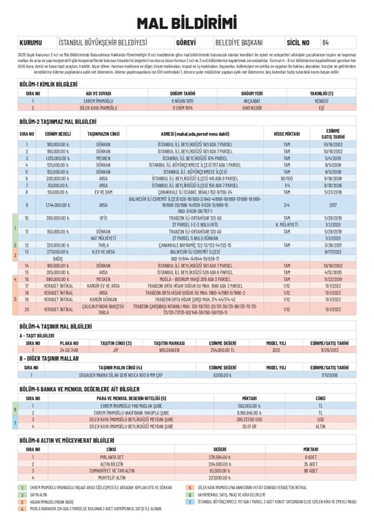 CHP'de Mansur Yavaş'ın ardından Ekrem İmamoğlu da mal varlığı bildiriminde bulundu. İmamoğlu, eşi Dilek Kaya İmamoğlu ve kendisinin mal varlığını açıkladı. İstanbul Büyükşehir Belediye (İBB) Başkanı Ekrem İmamoğlu, kendisinin ve eşi Dilek Kaya İmamoğlu'nun mal varlığını açıkladı. İmamoğlu'nun Beylikdüzü'nde 2 dükkan ve 1 mesken, Büyükçekmece'de 2 dükkan, Beylikdüzü'nde 2 arsa, Çanakkale'de ev, Balıkesir'de arsa, Trabzon'da ofis ve dükkan, Çanakkale'de tarla, Balıkesir'de arsası olduğu görüldü. Dilek Kaya İmamoğlu'nun ise Beylikdüzü'nde 1 arsa ve dükkan, Muğla'da mesken, Trabzon'da kargir ev ve arsa ile Trabzon'da tarlası bulunduğu kaydedildi. Dilek Kaya İmamoğlu'nun 2013 tarihinde alınan 'Wolsvagen' marak JİP'i olduğu belirtildi. Ekrem İmamoğlu'nun ise 2008 tarihinde alınan 8 bin TL değerinde silahı olduğu kaydedildi. Banka hesapları Ekrem İmamoğlu ile Dilek Kaya İmamoğlu'nun banka hesaplarında bulunan mal varlıklarına da yer verildi. Buna göre Ekrem İmamoğlu'nun bir bankada 8 milyon 166 bin 645 TL, diğer banka hesabında ise 562 bin TL'si olduğu görüldü. Dilek Kaya İmamoğlu'nun ise bir banka hesabında 395 bin 737 dolar, diğer banka hesabında 52 gram altını olduğu kaydedildi. Dilek Kaya İmamoğlu'nun 8 adet 279 bin 584 TL değerinde pırlanta seti, 35 adet 204 bin TL değerinde altın bilezik, 68 adet 92 bin TL değerinde cumhuriyet ve tam altın, 227 bin TL değerinde muhtelif altını olduğu görüldü. Mansur Yavaş da açıklamıştı Ankara Büyükşehir Belediye Başkanı Mansur Yavaş, kendisinin ve eşi Nursen Yavaş'ın mal varlığını açıklamıştı. [news_id:725097] [news_id:696007]