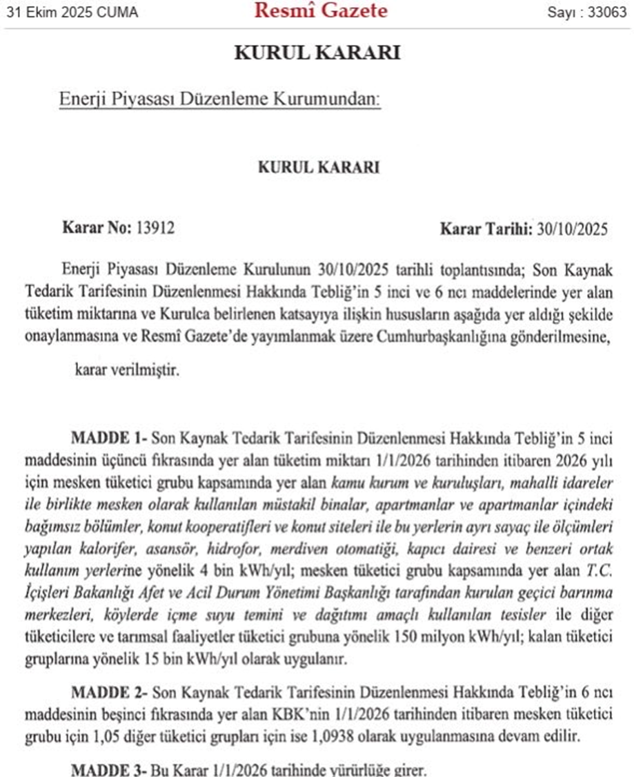 Resmi Gazete’de yayımlanan EPDK kararıyla elektrik tüketimi 4 bin kilovatsaati (yaklaşık 984 TL) geçen aboneler artık devlet desteği alamayacak. Resmi Gazete'de yayımlanan kararla elektrikte devlet desteğinde yeni düzenlemeye gidildi. Daha önce yapılan düzenlemeyle yıllık 5 bin kilovat saat elektrik tüketenler devlet desteğinden yararlanamıyordu. Yeni düzenlemede ise söz konusu tüketim limiti 4 bin kilovat saate düşürüldü. Buna göre yıllık tüketimi 4 bin kilovat saat ya da aylık 333 kilovat saati aşan aboneler artık devlet desteğinden yararlanamayacak. Yeni limitle birlikte faturası yaklaşık 984 TL ve üzerinde gelen aboneler devlet desteğinden faydalanamayacak. Elektrikli otomobilini evde şarj edenler büyük oranda limiti aşacağı için yüksek tarifeden elektrik kullanacak. Abonelerin yaklaşık yüzde 6'sını etkileyecek yeni karar, 1 Ocak 2026 tarihinden itibaren geçerli olacak. Kaynak: Resmi Gazete [news_id:789704]