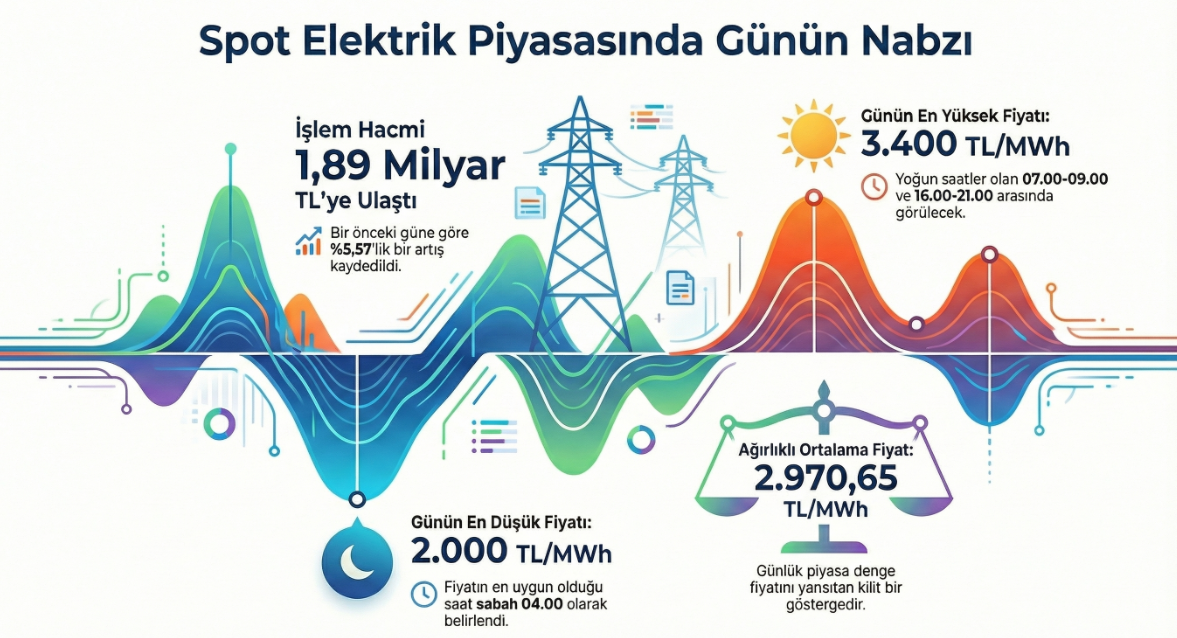 Spot elektrik piyasasında işlem hacmi artış gösterirken, yarın için megavatsaat başına en yüksek fiyat 3 bin 400 lira olarak kaydedildi. Enerji Piyasaları İşletme AŞ tarafından paylaşılan verilere göre, spot elektrik piyasasında işlem hacmi bugün, bir önceki güne kıyasla yüzde 5,57 oranında bir yükselişle 1 milyar 892 milyon 640 bin 282 lira seviyesine ulaştı. Gün öncesi piyasada yapılan değerlendirmelere göre, bir megavatsaat elektriğin fiyatı yarın belirli zaman dilimlerinde farklılık gösterecek. Fiyatın en yüksek seviyesi olan 3 bin 400 lira, sabah 07.00-09.00 ile öğleden sonra ve akşam saatlerini kapsayan 16.00-21.00 saat dilimleri için belirlendi. Günün en düşük fiyatı ise saat 04.00'te 2 bin lira olarak kayıtlara geçti. Piyasadaki fiyat dengelerine bakıldığında, bir megavatsaat elektriğin aritmetik ortalama fiyatı 2 bin 960 lira 6 kuruş olarak hesaplanırken, ağırlıklı ortalama fiyatı 2 bin 970 lira 65 kuruş seviyesinde gerçekleşti. Bugünün verileri incelendiğinde ise spot piyasada megavatsaat başına en yüksek fiyat 3 bin 400 lira, en düşük fiyat ise 1495 lira oldu.