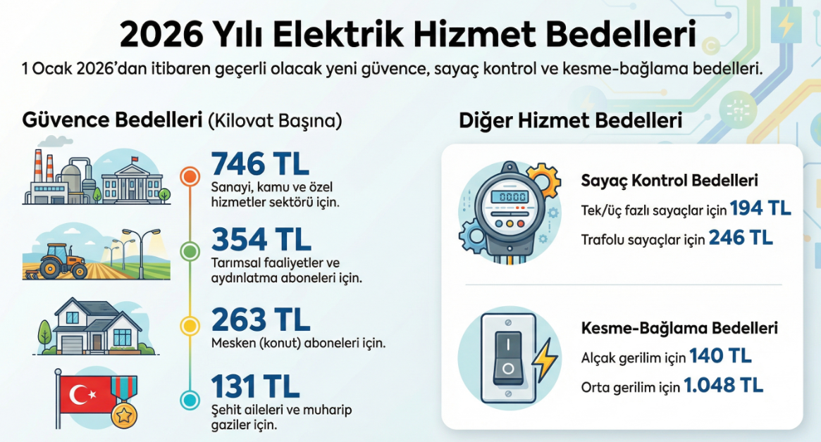Enerji Piyasası Düzenleme Kurumu (EPDK), elektrik piyasasında 2026'da uygulanacak sayaç kontrol, güvence ile kesme-bağlama bedellerini tespit etti. EPDK'nin konuya ilişkin kararı, Resmi Gazete'nin bugünkü sayısında yayımlandı. Buna göre, gelecek yıl uygulanacak sayaç kontrol bedelleri sayaç türüne göre farklılaştırıldı. Bu kapsamda direkt bağlı tek fazlı aktif veya 3 fazlı aktif ve/veya reaktif sayaçlar için kontrol bedeli 194 lira olarak belirlendi. Akım trafolu ve/veya gerilim trafolu aktif ve/veya reaktif sayaçlarda ise bu tutar 246 lira olarak uygulanacak. Güvence bedelleri tüketici gruplarına göre belirlendi Elektrik Piyasası Tüketici Hizmetleri Yönetmeliği kapsamında alınan kararla, 2026'da uygulanacak güvence bedelleri tüketici grupları bazında yeniden düzenlendi. Sanayi ile kamu ve özel hizmetler sektörü ile diğer tüketiciler için birim güvence bedeli kilovat başına 746 lira olarak tespit edildi. Mesken abonelerinde bu tutar 263 lira olurken, şehit aileleri ve muharip gaziler için 131 lira olarak belirlendi. Tarımsal faaliyetler, aydınlatma ve diğer abonelik gruplarında ise güvence bedeli kilovat başına 354 lira olarak uygulanacak. 2026'da uygulanacak kesme-bağlama bedelleri de gerilim seviyesine göre tespit edildi. Alçak gerilim aboneleri için kesme-bağlama bedeli 140 lira, orta gerilim aboneleri için 1048 lira olacak. Kurulun 25 Aralık tarihli toplantısında alınan kararlar, 1 Ocak 2026’dan itibaren yürürlüğe girecek.