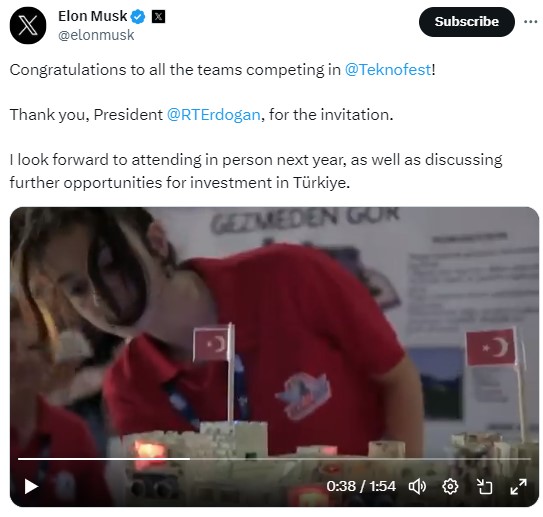 Tesla ve SpaceX'in CEO'su Elon Musk, gelecek yıl TEKNOFEST'e bizzat katılmayı ve Türkiye'deki yatırım fırsatlarını görüşmeyi dört gözle beklediğini ifade etti. Musk, X sosyal medya hesabında, Türkiye'nin en büyük havacılık, uzay ve teknoloji festivali TEKNOFEST'e ilişkin paylaşımda bulundu. TEKNOFEST'ten görüntülerin yer aldığı bir videoyu paylaşan Musk, festival kapsamındaki yarışmalara katılan tüm takımları tebrik etti. Musk, kendisini TEKNOFEST'e davet eden Cumhurbaşkanı Recep Tayyip Erdoğan'a teşekkür ederek, "Gelecek yıl TEKNOFEST'e bizzat katılmayı ve Türkiye'deki yatırım fırsatlarını görüşmeyi dört gözle bekliyorum." ifadesini kullandı. Kaynak: Elon Musk - X Cumhurbaşkanı Erdoğan, Birleşmiş Milletler (BM) 78. Genel Kurulu'na katılmak üzere geçen hafta gittiği New York'ta ikili görüşmeleri kapsamında Elon Musk'ı da kabul etmişti. [news_id:707775] Cumhurbaşkanlığı İletişim Başkanlığı'ndan kabule ilişkin yapılan açıklamaya göre, Cumhurbaşkanı Erdoğan, Türkiye'nin uzay programı kapsamında atılan ve atılacak adımlarda SpaceX ile iş birliği imkanlarının doğabileceğini belirterek, Musk'ı TEKNOFEST'e davet etmişti.