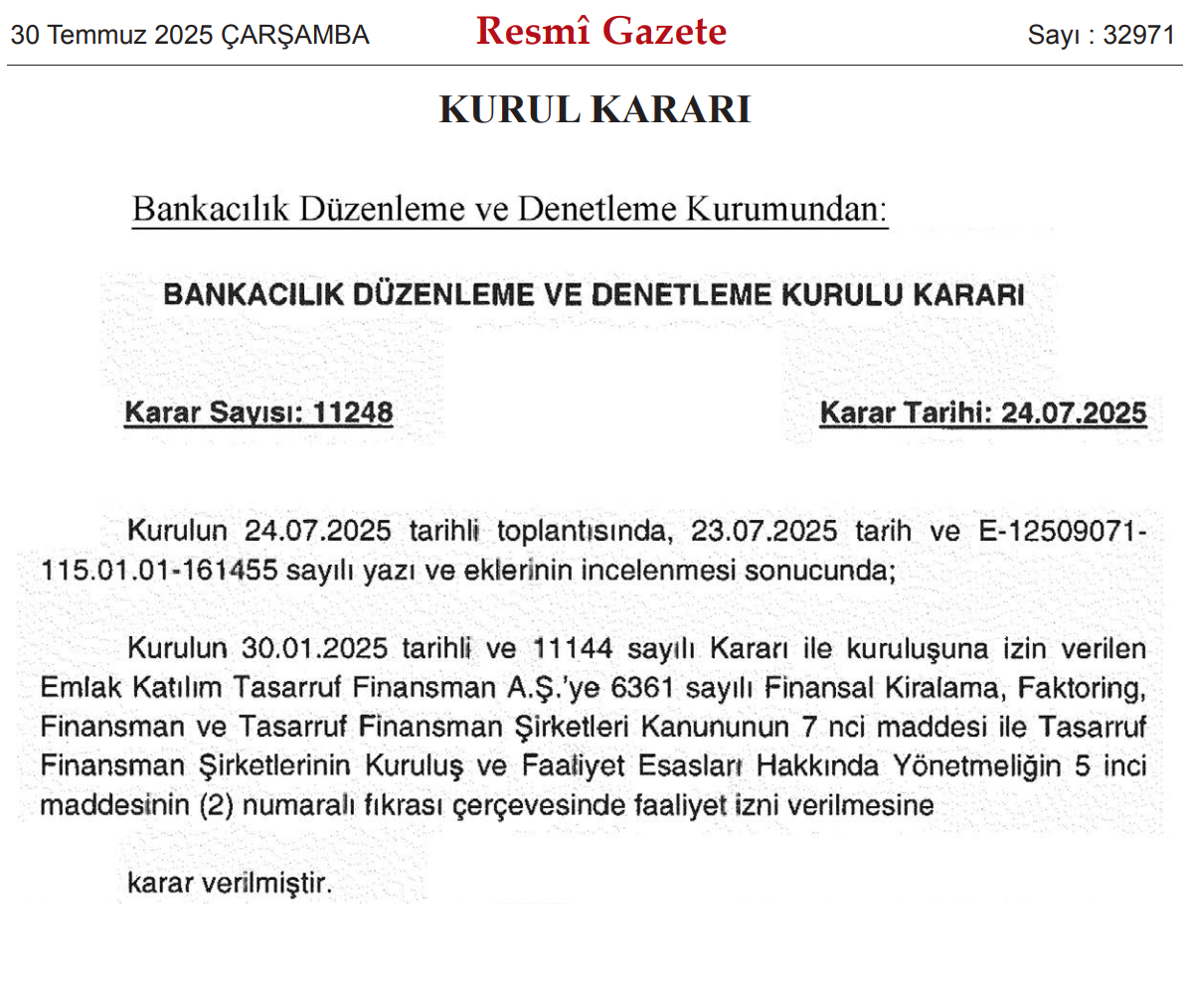 Bankacılık Düzenleme ve Denetleme Kurumunca (BDDK), Emlak Katılım Tasarruf Finansman AŞ'ye faaliyet izni verildi. BDDK tarafından, Emlak Katılım Tasarruf Finansman AŞ'ye Finansal Kiralama, Faktoring, Finansman ve Tasarruf Finansman Şirketleri Kanunu'nun 7'inci maddesi ile Tasarruf Finansman Şirketlerinin Kuruluş ve Faaliyet Esasları Hakkında Yönetmeliğin 5'inci maddesinin 2 numaralı fıkrası çerçevesinde faaliyet izni verilmesine ilişkin kurul kararı Resmi Gazete'de yayımlandı. Söz konusu şirkete kuruluş izni 30 Ocak 2025'te verilmişti. Kaynak: Resmi Gazete