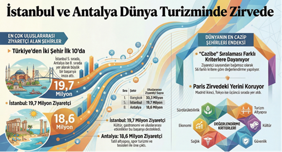 Turizmin en itibarlı veri kaynaklarından biri olan Euromonitor International’ın yayımladığı 2025 Top 100 City Destinations Index, Türkiye’nin hem ziyaretçi hacminde hem de turizm çekiciliğinde küresel ligde üst basamaklara yerleştiğini ortaya koydu. Euromonitor International’ın yayımladığı Top 100 City Destinations Index 2025 raporuna göre İstanbul ve Antalya, dünyanın en çok yabancı turist çeken şehirleri arasında ilk 10’a girmeyi başardı. Rapora göre İstanbul, 19,7 milyon uluslararası ziyaretçiyle dünya sıralamasında 5’inci, Antalya ise 18,6 milyon ziyaretçiyle 8’inci sıraya yerleşti. Böylece Türkiye, iki şehirle birden en üst sıralarda yer alarak küresel turizm sahnesindeki etkisini güçlendirdi. Listenin zirvesinde 30,3 milyon ziyaretçiyle Bangkok bulunurken, Hong Kong, Londra ve Makao ilk dört sırada yer aldı. İstanbul’un gastronomiden kültür-sanat etkinliklerine, uluslararası organizasyonlardan dijital tanıtım etkisine uzanan geniş yelpazedeki dinamizmi; Antalya’nın ise her sezon yüksek talep gören tatil altyapısı, spor turizmi ve dünya standartlarındaki tesisleri bu yükselişi destekledi. “En Cazip Şehirler” endeksinin lideri Paris Euromonitor International aynı raporda, ziyaretçi sayısından bağımsız olarak şehirlerin sürdürülebilirlik, kültür, ekonomik performans, sağlık ve güvenlik gibi 56 kritere göre belirlendiği “Dünyanın En Cazip 10 Şehri” listesini de açıkladı. Paris, Notre Dame Katedrali’nin yeniden açılması ve PSG’nin Şampiyonlar Ligi zaferinin yarattığı sportif turizm etkisiyle liderliğini korudu. Madrid ikinci, Tokyo üçüncü, Roma dördüncü, Milano ise beşinci sıraya yerleşti. Amsterdam ve Barcelona listede yükseliş gösterirken, Londra zayıf sürdürülebilirlik performansı nedeniyle 18’inci sıraya geriledi. [news_id:794283]