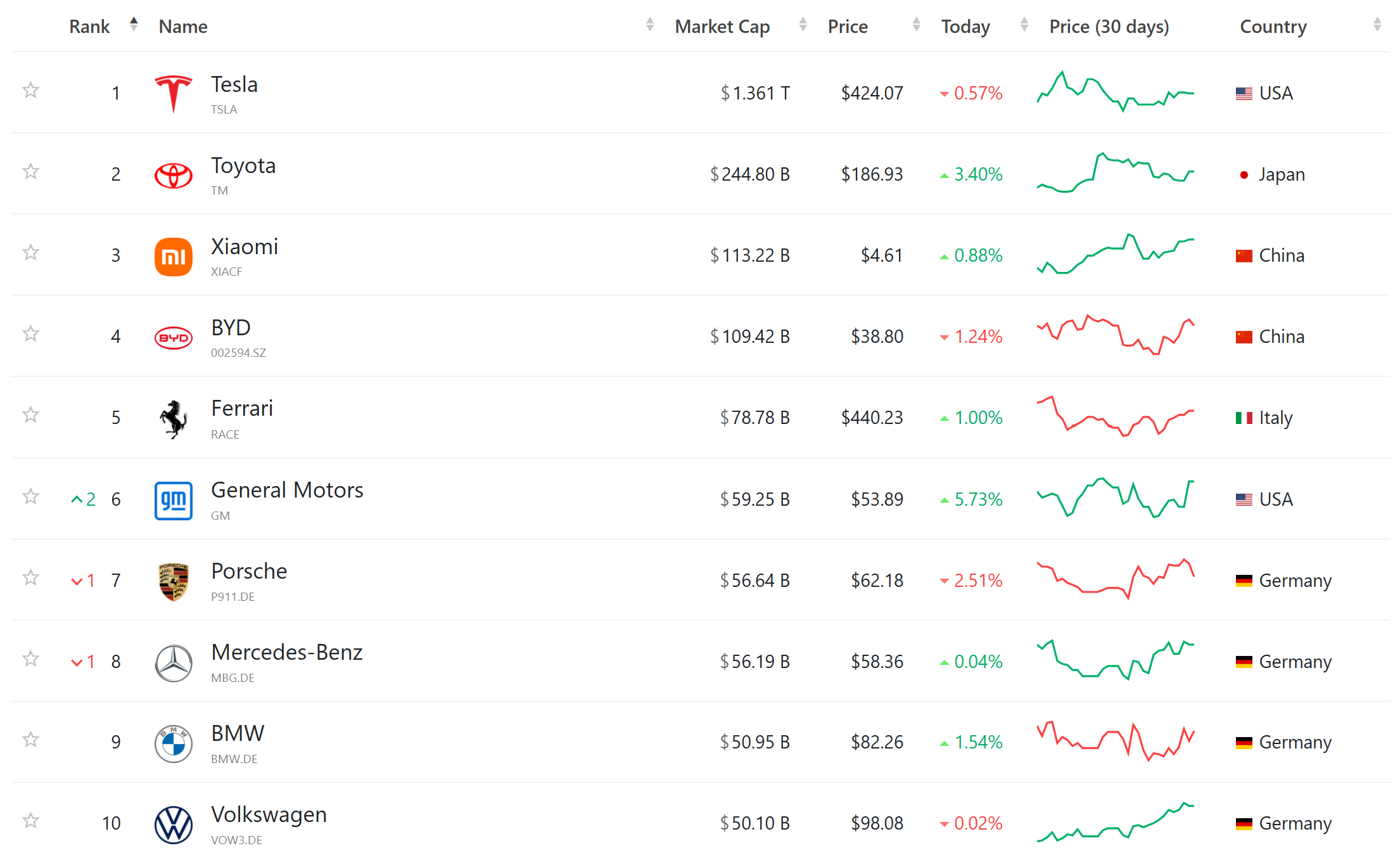 Piyasa değerine göre en değerli otomobil üreticileri açıklandı. Elektrikli araç şirketi Tesla'nın zirvede yer aldığı listede, iki Türk firması da kendine yer buldu. Companiesmarketcap sitesinden derlenen bilgilere göre en değerli 50 otomotiv üreticisinin belirlendiği listede, piyasa değeri 1 milyar doların üzerindeki şirketler yer alıyor. Sitede yer alan verilere göre listede ilk sırada 1,36 trilyon dolarlık piyasa değeri ile ABD'li elektrikli otomobil üreticisi Tesla geliyor. Elon Musk'ın sahibi olduğu Tesla, elektrikli araç tasarlayan, üreten ve satan bir otomotiv şirketi olarak öne çıkıyor. Listede 2. sırada 244 milyar dolarla Toyota, 3. sırada 113 milyar dolarla Xiaomi, 4. sırada 109 milyar dolarla BYD, 5. sırada 78,7 milyar dolarla Ferrari, 6. sırada 59,2 milyar dolarla General Motors, 7. sırada ise 56,6 milyar dolarla Porsche bulunuyor. Listenin 8. sırasında 56,19 milyar dolarla Mercedes-Benz yer alırken, 9. sırada 50,95 milyar dolarla BMW, 10. sırada ise 50,10 milyar dolarla Volkswagen bulunuyor. Kaynak: Companiesmarketcap Xiaomi SU7 ile listede kendisine yer buldu Xioami listede 3. sırada yer alsa da şirketin gelirlerinin büyük bölümü diğer teknoloji ürünlerinden geliyor. 2021'de elektrikli araç üretimine gireceğini duyuran şirket, geçen yıl "SU7" adını verdiği elektrikli spor otomobil modelini piyasaya sürmüştü. [news_id:753095] Listedeki Türk şirketler En fazla piyasa değerine sahip ilk 50 otomobil üreticisinden 17'sini Çinli, 8'ini Japon, 6'sını Amerikan, 4'ünü Alman ve 3'ünü Hint şirketler oluşturdu. Listede, Güney Kore, İsveç, Türkiye ve Tayvan'dan ikişer, Fransa, İtalya, Hollanda ve Vietnam'dan ise birer şirket yer aldı. Buna göre 9,12 milyar dolarlık piyasa değerine sahip Ford Otosan'ın 37. sıranın sahibi olduğu listede, diğer Türk otomobil üreticisi Tofaş 3,03 milyar dolarla 47. sırada kendisine yer buldu. [news_id:759708]