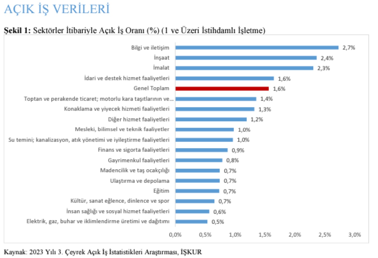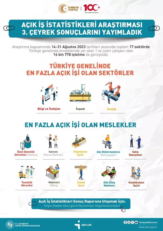 Çalışma ve Sosyal Güvenlik Bakanı Vedat Işıkhan, İŞKUR tarafından hazırlanan rapora göre Türkiye'de 272 bin 419 adet "açık iş ilanı" olduğunu söyledi. İşte ilgili rapora göre en fazla ilanı olan meslekler ve talep edilen beceriler... Bakan Işıkhan, en fazla işçi talep eden sektörler ile en fazla işçi aranan meslekleri belirlemek amacıyla İŞKUR tarafından hazırlanan Açık İş İstatistikleri Araştırması ile ilgili yaptığı açıklamada, iş gücü piyasasının ihtiyaçlarını tespit ederek iş arayanların istihdama katılımını kolaylaştırıcı adımlar atmaya devam ettiklerini belirtti. Bakan Işıkhan'ın atıfta bulunduğu rapora göre ise Türkiye genelinde 1 ve üzeri çalışanı olan 16 bin 778 işletme ile 14-31 Ağustos 2023 arasında görüşülerek yapılan araştırma, açık iş sayısının bir önceki yılın aynı dönemine kıyasla yüzde 29,3 oranında arttığını ve açık iş (işveren tarafından talep edilen-ihtiyaç duyulan eleman) sayısının 272 bin 419 olduğunu ortaya koydu. Açık iş oranının en yüksek olduğu sektörlerin başında ise "bilgi ve iletişim", "inşaat" ve "imalat" sektörleri geldi. Kaynak: İŞKUR - Açık İş İstatistikleri Açık işlerde talep edilen beceriler İŞKUR, Uluslararası Meslek Sınıflandırması’na göre tasnif edilen ana meslek gruplarının talep ettikleri becerileri ise şöyle listeledi: Kaynak: İŞKUR - Açık İş İstatistikleri En fazla açık iş ilanı olan meslekler Açık iş oranın en yüksek olduğu mesleklerin başında ise silahsız özel güvenlik görevlisi, garson ve paketleme işçisi meslekleri yer aldı. Bu meslekleri sırasıyla alçı dekorasyoncu, satış danışmanı, temizlik görevlisi, makineci, inşaat işçisi, düz dikiş makineci ve konfeksiyon işçisi takip etti. Kaynak: İŞKUR - Açık İş İstatistikleri [news_id:698377]