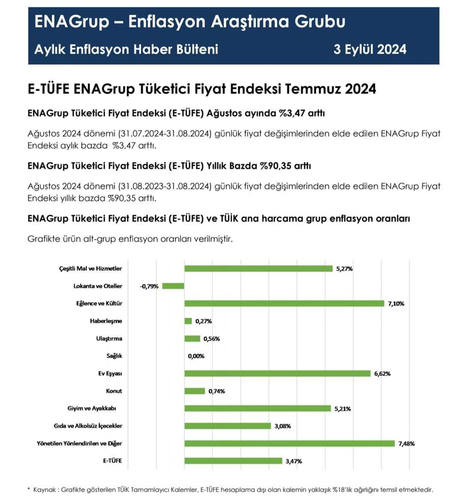 Enflasyon Araştırma Grubu (ENAG), ağustos ayına yönelik enflasyon hesaplamasının sonuçlarını paylaştı. ENAG'ın açıkladığı verilere göre ağustos ayında aylık enflasyon yüzde 3,47, yıllık enflasyon ise yüzde 90,35 artış kaydetti. Kaynak: ENAG Enflasyon rakamları için bir diğer öncü gösterge olan İstanbul Ticaret Odası’nın (İTO) İstanbul perakende fiyat endeksi ise pazar günü yayımlanmıştı. İstanbul Ticaret Odası'nın (İTO) verileri, perakende fiyatların aylık yüzde 1,73 ve yıllık yüzde 61,57 ile keskin bir yavaşlama gösterdiğini ortaya koymuştu. Veriye ilişkin AA Finans'ın beklenti anketine katılan ekonomistlerin tahminlerinin ortalaması ise yüzde 2,64 olmuştu. Ankete katılan ekonomistlerin ağustos ayı için enflasyon beklentileri en düşük yüzde 2,21, en yüksek yüzde 3,1 aralığında yer almıştı. Ekonomistlerin ağustos ayı enflasyon beklentilerinin ortalamasına göre bir önceki ay yüzde 61,78 olan yıllık enflasyonun ise yüzde 52,20'ye ineceği öngörülmüştü. [news_id:744017] Gözler resmi enflasyon rakamlarında ENAG ve İTO tarafından paylaşılan enflasyon rakamları sonrasında gözler ise TÜİK'in saat 10.00 itibarıyla açıklayacağı resmi enflasyon verilerinde olacak. Enflasyon rakamlarının açıklanmasıyla birlikte eylül ayında kiralarda uygulanacak zam sınırı da belli olacak. [news_id:743445]