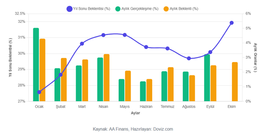 Enflasyon Araştırma Grubu (ENAG), ekim ayına yönelik enflasyon hesaplamasının sonuçlarını paylaştı. ENAG'ın açıkladığı verilere göre ekim ayında enflasyon aylık bazda yüzde 3,74, yıllık bazda ise yüzde 60 artış kaydetti. ENAG, son olarak eylül ayında enflasyonun aylık yüzde 3,79, yıllık ise yüzde 63,23 artış gösterdiğini hesaplamıştı. İTO verileri enflasyonun ivme kazandığına işaret etmişti Enflasyon rakamları için bir diğer öncü gösterge olan İTO’nun İstanbul Tüketici Fiyat İndeksi verileri ise cumartesi günü yayımlanmıştı. İTO, ekim ayında İstanbul'da perakende fiyatların aylık yüzde 3,31, yıllık yüzde 40,84 yükseliş kaydettiğini duyurmuştu. İTO'nun açıkladığı verilere göre ekim ayı enflasyonunda yaşanan yükseliş üzerinde aylık bazda yüzde 17'nin üzerinde artış gösteren giyim ve ayakkabı grubu etkili olmuştu. [news_id:790372] Gözler TÜİK verilerinde ENAG ve İTO tarafından paylaşılan enflasyon rakamları sonrasında gözler TÜİK'in saat 10.00 itibarıyla açıklayacağı resmi enflasyon verilerine çevrildi. 28 ekonomistin katılımıyla gerçekleşen ekim ayı enflasyon beklenti anketine göre Tüketici Fiyat Endeksi'nde (TÜFE) ortalama yüzde 2,69 oranında artış bekleniyor. Ekonomistlerin 2025 sonu enflasyon beklentisi ise yüzde 31,93 seviyesinde bulunuyor.