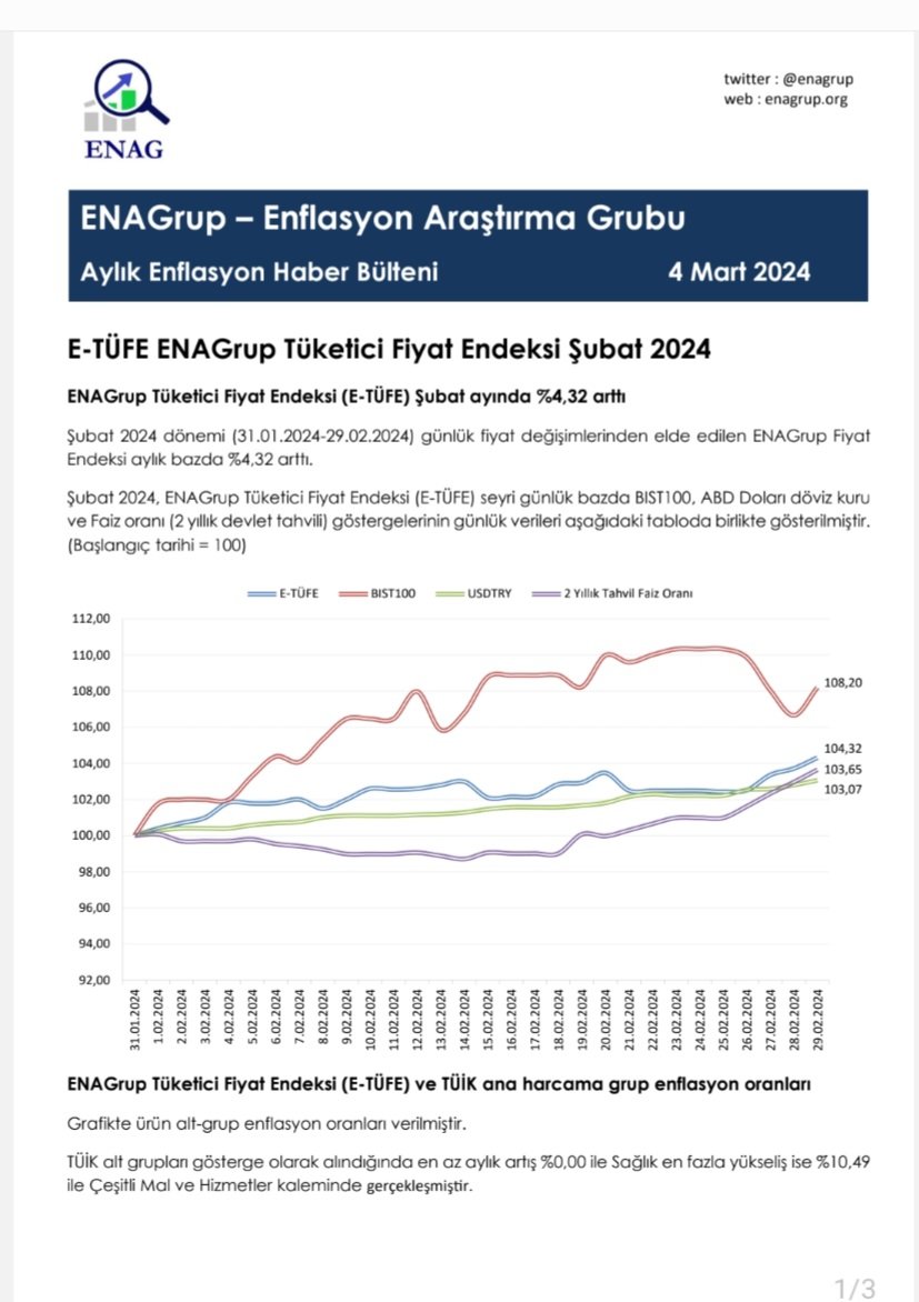 Enflasyon Araştırma Grubu (ENAG), şubat ayına yönelik enflasyon hesaplaması sonuçlarını paylaştı ENAG verilerine göre, Tüketici Fiyat Endeksi (E-TÜFE) şubat ayında yüzde 4.32 arttı. E-TÜFE’nin son 12 aylık artışı da yüzde 121.98 olarak gerçekleşti. Ayrıntılar geliyor... ENAG, ocak ayına yönelik enflasyon hesaplamasının sonuçlarını ise aşağıdaki gibi paylaşmıştı. Tüketici Fiyat Endeksinin (E-TÜFE) ocak ayında yüzde 9,38 arttığını belirten ENAG, E-TÜFE’nin son 12 aylık artışını da yüzde 129,11 olarak gerçekleştiğini açıklamıştı. ENAG tarafından paylaşılan enflasyon rakamları sonrasında gözler, TÜİK'in saat 10.00 itibarıyla açıklayacağı resmi enflasyon rakamlarında olacak.