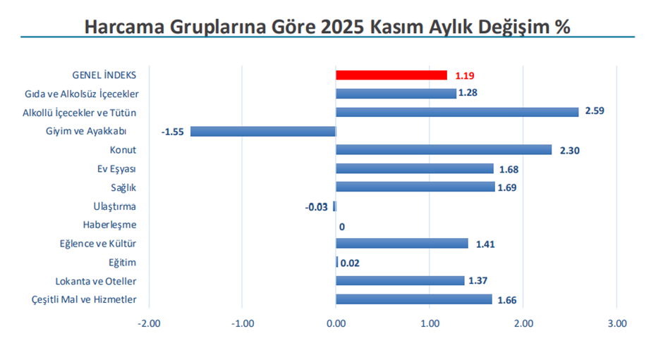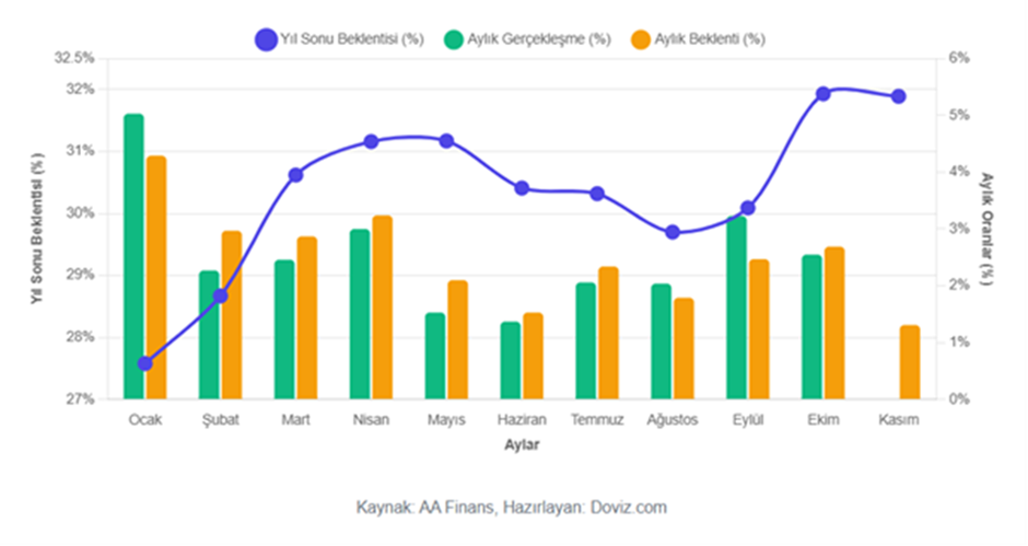 Enflasyon Araştırma Grubu (ENAG), kasım ayına yönelik enflasyon hesaplamasının sonuçlarını paylaştı. ENAG'ın açıkladığı verilere göre kasım ayında enflasyon aylık bazda yüzde 2,13, yıllık bazda ise yüzde 56,82 artış kaydetti. ENAG, son olarak ekim ayında enflasyonun aylık yüzde 3,74, yıllık ise yüzde 60 artış gösterdiğini hesaplamıştı. İTO verileri enflasyonun yavaşladığını göstermişti Enflasyon rakamları için bir diğer öncü gösterge olan İTO’nun İstanbul Tüketici Fiyat İndeksi verileri ise pazartesi günü yayımlanmıştı. İTO, kasım ayında İstanbul'da perakende fiyatların aylık yüzde 1,19, yıllık ise yüzde 38,28 yükseliş kaydettiğini duyurmuştu. İTO'nun açıkladığı verilere göre kasım ayında en fazla fiyat artışı yüzde 2,59 ile alkollü içecekler ve tütün grubunda, en fazla fiyat düşüşü ise yüzde 1,55 ile giyim ve ayakkabı grubunda yaşanmıştı. Gözler TÜİK verilerinde ENAG ve İTO tarafından paylaşılan enflasyon rakamları sonrasında gözler TÜİK'in saat 10.00 itibarıyla açıklayacağı resmi enflasyon rakamlarına çevrildi. 32 ekonomistin katılımıyla gerçekleşen kasım ayı enflasyon beklenti anketine göre Tüketici Fiyat Endeksi'nde (TÜFE) ortalama yüzde 1,31 oranında artış bekleniyor. Ekonomistlerin 2025 sonu enflasyon beklentisi ise yüzde 31,89 seviyesinde bulunuyor. [news_id:793235]