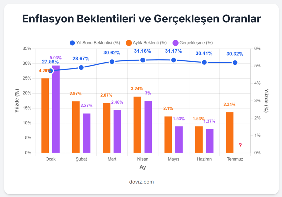 Enflasyon Araştırma Grubu (ENAG), temmuz ayına yönelik enflasyon hesaplamasının sonuçlarını paylaştı. ENAG'ın açıkladığı verilere göre temmuz ayında enflasyon aylık bazda yüzde 3,75, yıllık bazda ise yüzde 65,15 artış kaydetti. ENAG enflasyondaki artışı son olarak haziran ayında aylık yüzde 3,05, yıllık ise yüzde 68,68 sevisinde hesaplamıştı. Enflasyon rakamları için bir diğer öncü gösterge olan İTO’nun İstanbul Tüketici Fiyat İndeksi verileri de cuma günü yayımlanmıştı. İTO, temmuz ayında İstanbul'da perakende fiyatların aylık yüzde 2,62, yıllık yüzde 42,48 artış gösterdiğini duyurmuştu. [news_id:780430] Gözler TÜİK’in resmi rakamlarında ENAG ve İTO tarafından paylaşılan enflasyon rakamları sonrasında piyasalar ise TÜİK'in saat 10.00 itibarıyla açıklayacağı resmi enflasyon rakamlarını beklemeye başladı. 17 ekonomistin katılımıyla gerçekleşen temmuz ayı enflasyon beklenti anketinde ekonomistlerin Tüketici Fiyat Endeksi'nde (TÜFE) ortalama yüzde 2,34 oranında artış öngördüğü ortaya çıkmıştı. 2025 yılında aylar itibarıyla ekonomistlerin enflasyon beklentileri ve gerçekleşmeleri ise şöyle listelenmişti: [news_id:780029]