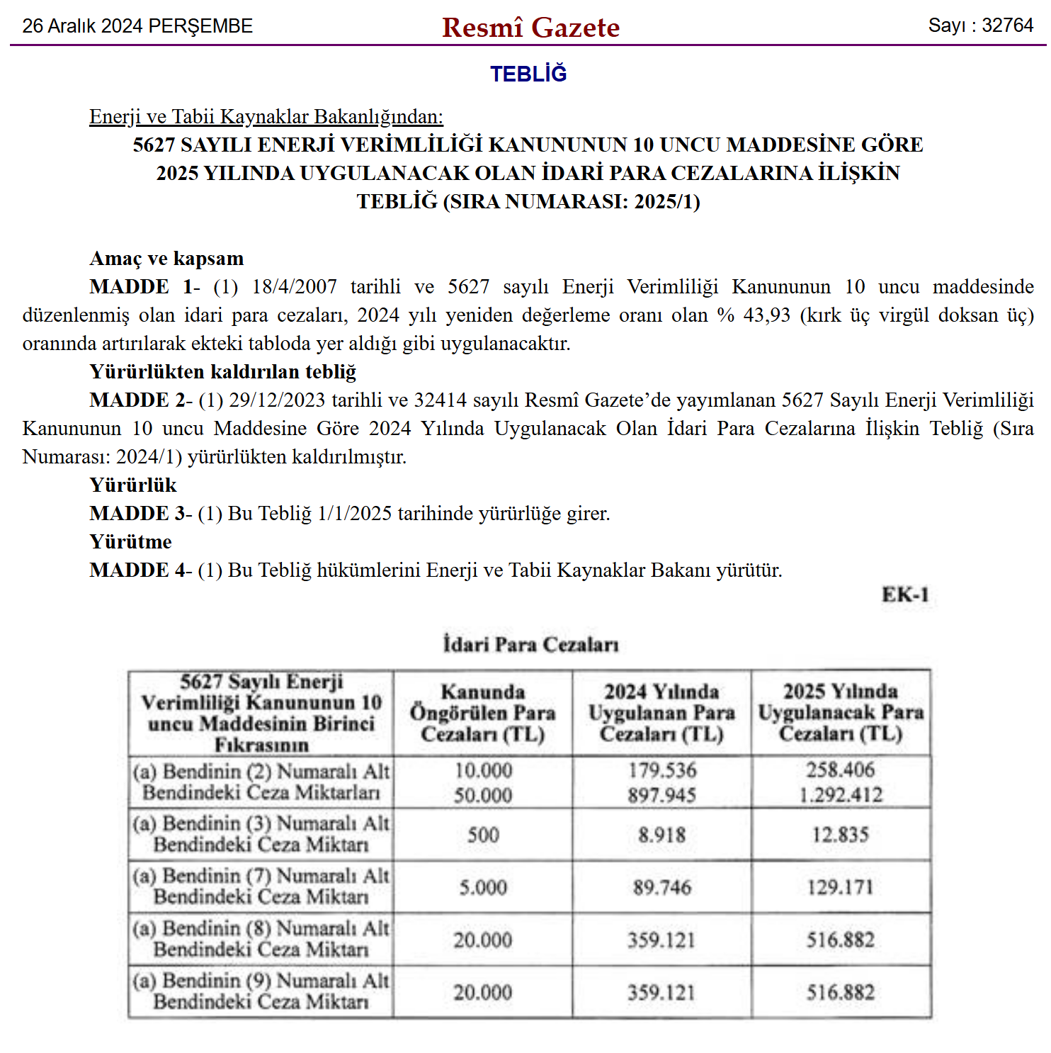 Enerji Verimliliği Kanunu kapsamında uygulanan idari para cezalarının 2025 için miktarları belirlendi. Enerji ve Tabii Kaynaklar Bakanlığının konuya ilişkin tebliği, Resmi Gazete'nin bugünkü sayısında yayımlandı. Enerji Verimliliği Kanunu'nda belirlenen yönetmelik hükümlerine aykırı hareket edilmesi halinde verilecek idari para cezaları, 2024 yeniden değerleme seviyesi olan yüzde 43,93 oranında artırıldı. Buna göre, uygulanacak idari para cezaları 12 bin 835 lira ile 516 bin 882 lira arasında değişiklik gösterecek. Kaynak: Resmi Gazete