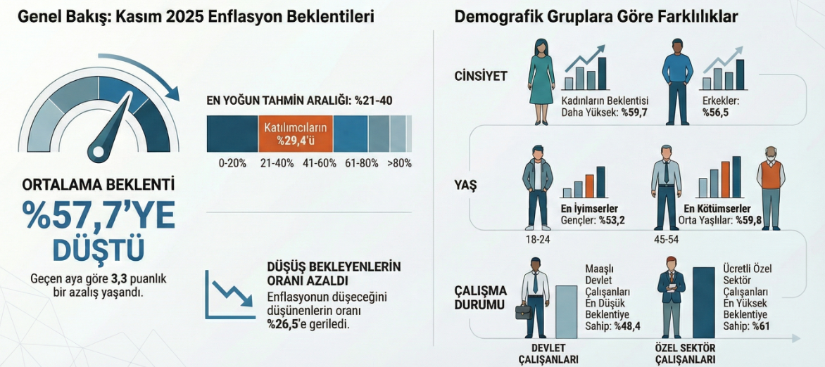 Bahçeşehir Üniversitesi Ekonomik ve Toplumsal Araştırmalar Merkezi (BETAM), vatandaşın bir yıl sonrasına ilişkin enflasyon beklentisinin düştüğünü duyurdu. Peki, enflasyondan en tedirgin kesim kimler oldu? İşte detaylar.. Bahçeşehir Üniversitesi Ekonomik ve Toplumsal Araştırmalar Merkezi (Betam), Kasım 2025 Hanehalkı Enflasyon Beklentileri Araştırması’nın sonuçlarını yayımladı. BETAM'dan Dr. Gökhan Şahin Güneş’in imzasıyla yayımlanan araştırmaya göre, hane halkının bir yıl sonrası için enflasyon beklentisi kasımda yüzde 57,7’ye indi. Bu oran, geçen aya göre 3,3 puanlık düşüşe işaret etti. İlgili araştırmaya katılanların yüzde 29,4’ü gelecek yıl enflasyonun yüzde 21-40 aralığında olacağını öngördü. Enflasyonun mevcut seviyeden daha düşük olacağını düşünenlerin oranı ise yüzde 26,5 oldu. Kasım ayında erkeklerin ortalama enflasyon beklentisi yüzde 56,5 olurken, kadınlarda bu oran yüzde 59,7 olarak ölçüldü. Kadınların beklentisi bir önceki aya göre 7,3 puan gerileme gösterdi. Yaş grubuna göre enflasyon beklentileri Yaş gruplarına bakıldığında en düşük beklenti yüzde 53,2 ile 18-24 yaş grubunda görüldü. Bu grupta bir önceki aya göre 6,7 puanlık sert düşüş kaydedildi. En yüksek beklenti ise yüzde 59,8 ile 45-54 yaş grubunda gerçekleşti. En tedirgin grup özel sektör çalışanları İş durumuna göre enflasyon beklentilerinde en yüksek azalış öğrencilerde görüldü. Öğrencilerin beklentisi bir ayda 9,3 puan gerileyerek yüzde 58,9’a indi. Enflasyon beklentilerindeki düşüşte öğrencileri maaşlı devlet çalışanları izledi. Maaşlı devlet çalışanlarının beklentisi 9,1 puan azalışla yüzde 48,4'e geriledi. Enflasyondan en tedirgin grubun ise özel sektör çalışanları olduğu görüldü. Özel sektör çalışanlarında beklenti 1,6 puan artışla yüzde 61’e yükseldi. [news_id:792847]