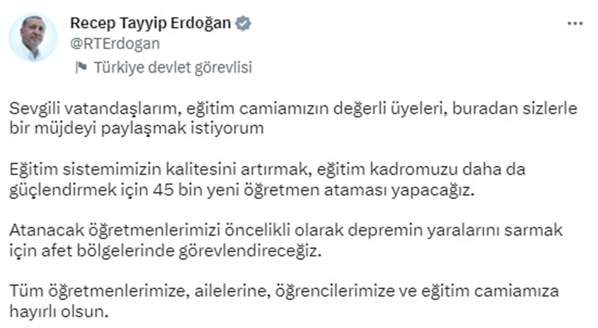 Cumhurbaşkanı Erdoğan, sosyal medya hesabından yaptığı paylaşımda 45 bin yeni öğretmen atamasının yapılacağını duyurdu. Cumhurbaşkanı Erdoğan, Twitter hesabından yaptığı açıklamada şunları kaydetti: "Sevgili vatandaşlarım, eğitim camiamızın değerli üyeleri, buradan sizlerle bir müjdeyi paylaşmak istiyorum. Eğitim sistemimizin kalitesini artırmak, eğitim kadromuzu daha da güçlendirmek için 45 bin yeni öğretmen ataması yapacağız. Atanacak öğretmenlerimizi öncelikli olarak depremin yaralarını sarmak için afet bölgelerinde görevlendireceğiz." Kaynak: Recep Tayyip Erdoğan - Twitter