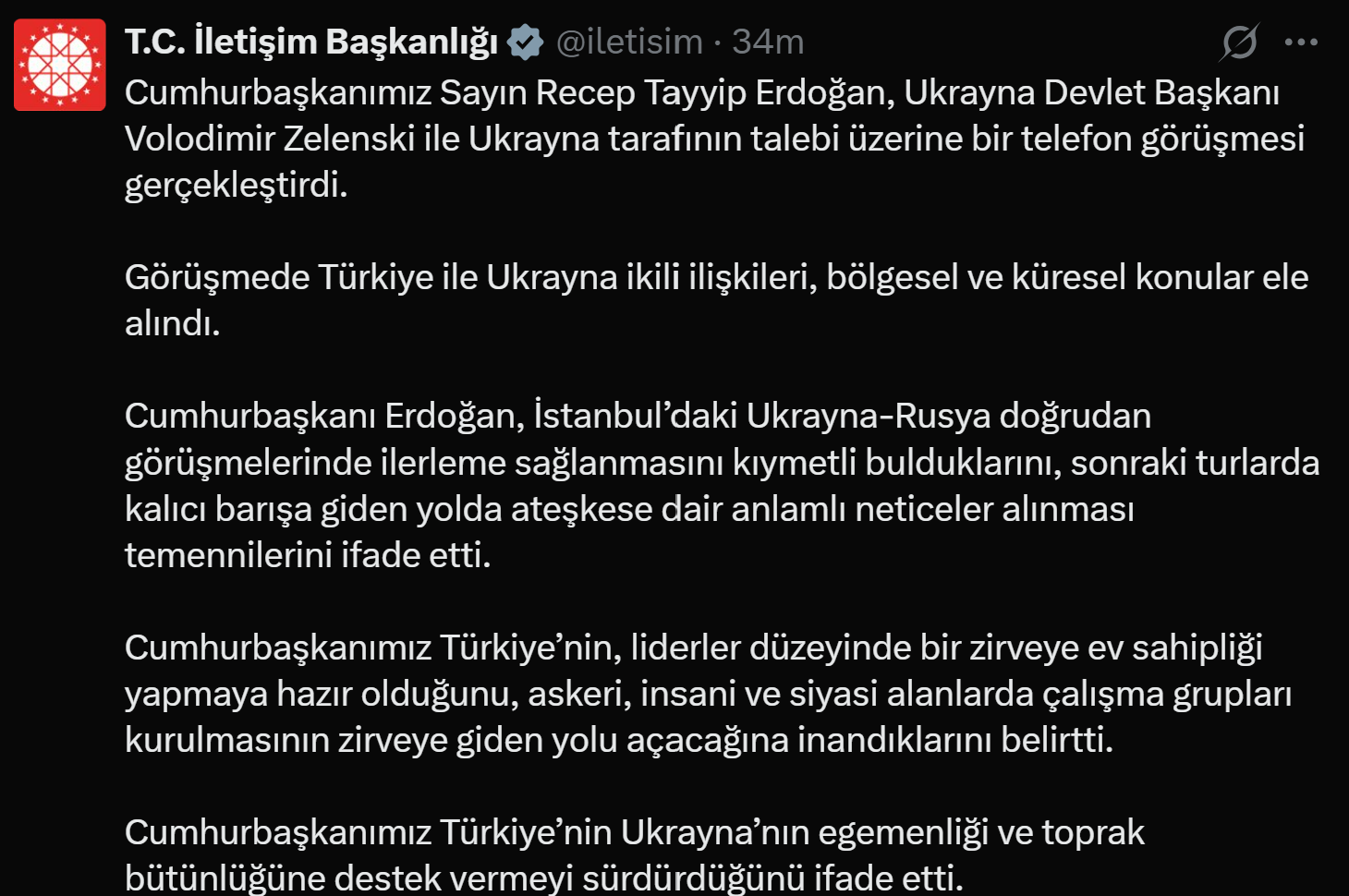 Cumhurbaşkanı Recep Tayyip Erdoğan, Ukrayna Devlet Başkanı Volodimir Zelenski ile telefon görüşmesi gerçekleştirdi. İletişim Başkanlığı, Erdoğan’ın Ukrayna Devlet Başkanı Volodimir Zelenski ile Ukrayna tarafının talebi üzerine bir telefon görüşmesi gerçekleştirdiğini açıkladı. İlgili açıklamada, görüşmede Türkiye ile Ukrayna ikili ilişkilerinin, bölgesel ve küresel konuların ele alındığı bildirildi. İletişim Başkanlığı’ndan yapılan açıklamada görüşmeye ilişkin şunlar aktarıldı: “Cumhurbaşkanımız Sayın Recep Tayyip Erdoğan, Ukrayna Devlet Başkanı Volodimir Zelenski ile Ukrayna tarafının talebi üzerine bir telefon görüşmesi gerçekleştirdi. Görüşmede Türkiye ile Ukrayna ikili ilişkileri, bölgesel ve küresel konular ele alındı. Cumhurbaşkanı Erdoğan, İstanbul’daki Ukrayna-Rusya doğrudan görüşmelerinde ilerleme sağlanmasını kıymetli bulduklarını, sonraki turlarda kalıcı barışa giden yolda ateşkese dair anlamlı neticeler alınması temennilerini ifade etti. Cumhurbaşkanımız Türkiye’nin, liderler düzeyinde bir zirveye ev sahipliği yapmaya hazır olduğunu, askeri, insani ve siyasi alanlarda çalışma grupları kurulmasının zirveye giden yolu açacağına inandıklarını belirtti. Cumhurbaşkanımız Türkiye’nin Ukrayna’nın egemenliği ve toprak bütünlüğüne destek vermeyi sürdürdüğünü ifade etti.”