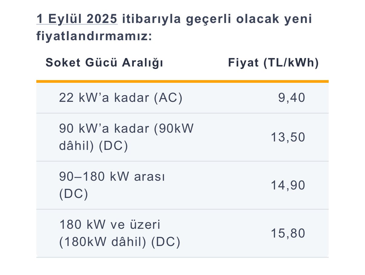 Eşarj, elektrikli araçların şarj ücretlerine yılın üçüncü zammını yaptı. Türkiye’nin en yaygın elektrikli araç şarj ağlarından biri olan Eşarj, 1 Eylül 2025 itibarıyla geçerli olmak üzere elektrikli arçaların şarj ücretlerine yeni bir zam yaptığını açıkladı. Şirketin açıkladığı yeni tarifeye göre AC şarj (22 kW’a kadar) fiyatı 9,40 TL/kWh seviyesinde sabit kalırken, 90 kW olan DC şarj soketleri 13,50 TL/kWh fiyatla hizmet verecek. Böylelikle şirket, yaklaşık yüzde 13,5'lik bir artış gerçekleştirmiş olacak. Öte yandan daha yüksek hız isteyen kullanıcılar için 90-180 kW arası DC şarj fiyatı 14,90 TL/kWh olarak belirlenirken, 180 kW ve üzeri için ilk defa ayrı bir tarife uygulanarak fiyat 15,80 TL/kWh'ye çıkarıldı. Kaynak: Eşarj