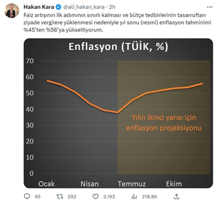 Eski TCMB Başekonomisti Hakan Kara yıl sonuna ilişkin enflasyon tahminini revize etti. Buna göre Hakan Kara, sosyal medya hesabından yaptığı açıklamada, bugün gelen vergi zamlarını değerlendirerek, “Faiz artışının ilk adımının sınırlı kalması ve bütçe tedbirlerinin tasarruftan ziyade vergilere yüklenmesi nedeniyle yıl sonu (resmi) enflasyon tahminimi yüzde 45’ten yüzde 56’ya yükseltiyorum.” dedi. Kaynak: Hakan Kara - Twitter [news_id:699882]