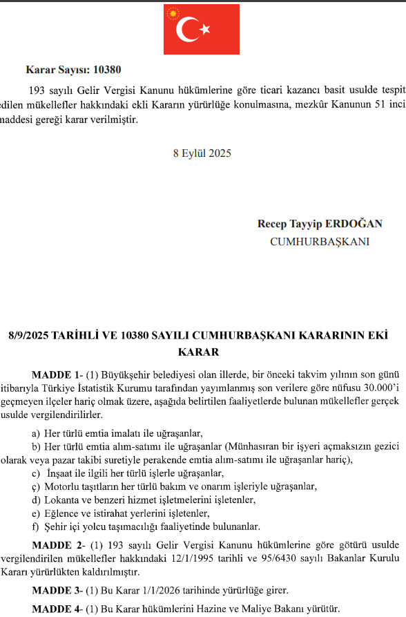 Resmi Gazete'de yer alan Cumhurbaşkanı kararına göre Büyükşehir Belediyesi olan illerde 30 binin üzerindeki ilçelerde faaliyet gösteren bazı mükellefler artık basit değil gerçek usulde vergilendirilecek. Peki, karardan etkilenecek meslek grupları neler olacak? İşte detaylar.. Bazı mükelleflerin basit vergilendirme usulünün kapsamından çıkarılması hakkındaki karar Resmi Gazete'de yayımlanarak yürürlüğe girdi. Düzenlemeyle 193 sayılı Gelir Vergisi Kanununun 51 inci maddesi gereği, Büyükşehir belediyesi olan illerde 30 binin üzerindeki ilçelerdeki bazı mükelleflerin basit değil gerçek usulde vergilendirilmesine karar verildi. Gerçek usulde vergilendirilecek faaliyetler ise şöyle sıralandı: 📌 Her türlü emtia imalatı ile uğraşanlar, 📌 Her türlü emtia alımı satımı ile uğraşanlar, 📌 İnşaat ile ilgili her türlü işle uğraşanlar, 📌 Motorlu taşıtların her türü bakım ve onarım işleri, 📌 Lokanta ve benzeri hizmet işletmelerini işletenler, 📌 Eğelence ve istirahat yerleri işletenler, 📌 Şehir içi yolcu taşımacılığı (taksi, dolmuş, minibüs, servis, halk otobüsü) faaliyetinde bulunanlar. TÜSİAV: Gelir vergisi paylarında önemli artış olacak Türkiye Sanayici ve İşadamları Vakfı (TÜSİAV) Vergi Platformu Başkanı Serkan Kumdakçı ise halen 2,7 milyon gelir vergisi mükellefinin 815 bininin basit usulde vergilendirildiğini, kararla bunların önemli kısmının gerçek usule geçirilerek gelir vergisinin paylarının artırılmış olacağını kaydetti. Kararla dolaylı vergi ve KDV tahakkukunun artacağını da belirten Kumdakçı, mükellefler arasında haksız rekabetin önlenmesinin amaçlandığını ifade etti. Basit usul ve gerçek usul arasındaki farklar neler? Basit usulde sadece ticari kazanç üzerinden vergi alınıyor. KDV, stopaj, geçici vergi gibi ek yükümlülükler bulunmuyor. Defter tutulmuyor, gelir vergisi beyannamesi verilmiyor. Gerçek usulde ise mükellefler KDV, gelir vergisi, stopaj ve geçici vergi ödüyor. Defter tutma zorunluluğu bulunuyor. Ancak bu sistemde gider faturaları vergiden düşülebiliyor, bu da doğru planlamayla vergi yükünün azaltılmasına destek oluyor. Ayrıca işletmenin mali durumu daha şeffaf göründüğü için kredi çekmek gibi konular gerçek usulde daha fazla avantaj sağlıyor. Kaynak: Resmi Gazete
