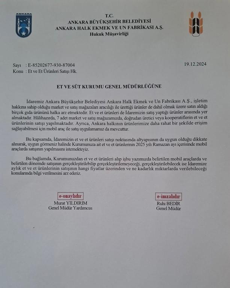 Ankara Büyükşehir Belediyesi’ne bağlı ABB Halk Ekmek A.Ş. belediyeye ait marketlerde ve mobil satış araçlarında fiyatlı et ürünlerini satmak için resmi başvuruda bulundu ancak başvuru Et ve Süt Kurumu'nca reddedildi. Birgün'de yer alan habere göre Et ve Süt Kurumu’nun Muhsin Yazıcıoğlu Caddesi’ndeki Ankara’daki tek satış mağazası, ödediği aylık yaklaşık 700 bin TL’lik kira gerekçe gösterilerek 2023 yılında kapatıldı. Bu kapatma sonrası dar gelirli vatandaşların uygun fiyatlı ete erişimi büyük ölçüde zorlaştı. Ankara Büyükşehir Belediyesi’ne bağlı ABB Halk Ekmek A.Ş. ise belediyeye ait marketlerde ve mobil satış araçlarında ESK’ye ait uygun fiyatlı et ürünlerini satmak için resmi başvuruda bulundu. Başvuruda, Halk Ekmek mağazalarında, ABB Marketlerde ve Mobil satış araçlarında vatandaşa uygun fiyatlı et ulaştırılmak istendiği belirtildi ve ESK’den ürün fiyat listesi talep edildi. Kaynak: Birgün Gazetesi Ancak Et ve Süt Kurumu, başvuruyu resmi yazıyla “talep karşılanamayacaktır” şeklinde yanıt verdi. Kurumun ret yazısında, "Mağazalarda yoğun talep olduğu, üretim kapasitesinin Tarım Kredi Marketleri ile zincir marketlere yönlendirildiği ve bu nedenle ABB’ye ürün verilemeyeceği" ifadeleri yer aldı. Son 10 günde yüzde 15'lik zam gelmişti İstanbul Perakendeci Kasaplar Odası Başkanı Aydın Tüfekçi ise karkas et fiyatlarına son 10 günde ete gelen yüzde 15'lik zam geldiğini açıklamıştı. Bu zam oranının karkas etin kilosunda 40 ila 65 liralık bir artışa tekabül ettiğini belirten Tüfekçi, güncel piyasa verilerini şöyle aktarmıştı: “Karkas etin kilosu 520-550 lira arasında seyrediyor. İstanbul’daki kasaplarda dana kıyma 800 liradan başlayıp bölgelere göre 1.100 liraya kadar çıkıyor. Dana kuşbaşının kilosu 950 ile 1.100 lira arasında değişirken, Balıkesir kıvırcık koyununun karkas kilogram fiyatı ise 650 liraya ulaşmış durumda.” [news_id:793114]