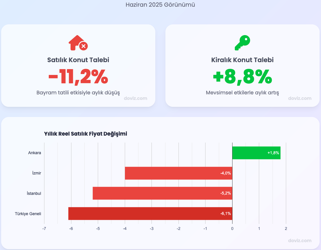 Haziran 2025’te satılık konutlara yönelik talep düşerken, kiralık konut arayışlarında mevsimsel yükseliş yaşandı; fiyatlardaki yıllık reel değişim ise çoğunlukla negatif yönde seyretti. Konut piyasasında talep dalgalandı, reel fiyatlar düşüşte kaldı sahibindencom ile Bahçeşehir Üniversitesi Ekonomik ve Toplumsal Araştırmalar Merkezi (BETAM) iş birliğiyle hazırlanan ve güncel veriler ışığında haziran ayının nabzını tutan "sahibindex Kiralık ve Satılık Konut Piyasası Görünümü" raporu kamuoyuyla paylaşıldı. Raporda, "haziran ayının kiralık ve satılık konut piyasasındaki değişimleri mercek altına alındı" ifadesi yer aldı. Satılık konutlara yönelik talep endeksi haziran ayında, bayram tatilinin de etkisiyle bir önceki aya oranla yüzde 11,2 oranında gerilerken, aynı dönemde kiralık konutlara yönelik talep endeksi mevsimsel etkilerin baskısıyla yüzde 8,8 oranında yükseldi. Satılık konut piyasasında Haziran 2025 itibarıyla reel fiyatlar ülke genelinde bir önceki yıla kıyasla yüzde -6,1 oranında geriledi. İstanbul özelinde bu oran yüzde -5,2, İzmir'de yüzde -4 olarak ölçüldü. Ankara ise farklı bir seyir izleyerek yüzde 1,8 oranında pozitif yıllık reel fiyat değişimiyle ayrıştı. Satılık konutların cari fiyatlarındaki yıllık artış oranı ise Mayıs 2025’e göre 0,3 puanlık azalışla yüzde 26,8 seviyesine indi. Satış fiyatlarında gerileme devam etti, metrekare fiyatları öne çıktı Temmuz 2023’ten bu yana düşüş yönlü hareket eden ülke genelindeki reel konut satış fiyat endeksi, Haziran 2025’te 0,1 puanlık hafif bir yükselişle 156 seviyesine ulaştı. Yıllık fiyat değişimi oranı aynı ayda ülke genelinde yüzde -6,1 oldu. Rapora göre, "reel fiyatlardaki yıllık düşüşün Haziran 2024'ten itibaren ivme kaybettiği görüldü". Haziran ayı itibarıyla ülke genelindeki ortalama konutun cari fiyatlar bazında yıllık artış oranı yüzde 26,8,1 düzeyinde ölçüldü. Aynı tarihte ortalama satılık konut metrekare fiyatı Türkiye genelinde 36 bin 798 lira olarak hesaplandı. İstanbul’da bu rakam 51 bin 230 lira olurken, Ankara’da 30 bin lira ve İzmir’de 43 bin 889 lira olarak kaydedildi. Konut talep endeksinde bayram etkili düşüş Konut talebinde önceki aylarda görülen yükseliş eğilimi, Haziran 2025’te bayram tatilinin etkisiyle kesintiye uğradı. Nisan ayında yukarı yönlü bir ivme kazanmış olan konut talep endeksi, haziranda bir önceki aya oranla yüzde 11,2’lik düşüşle 135,4 seviyesine geriledi. Bu gerilemeye rağmen, söz konusu endeks geçen yılın aynı dönemine göre yüzde 31 oranında daha yüksek ölçüldü. Kiralık konutta reel artış ve mevsimsel canlanma Reel kira endeksi Türkiye genelinde Haziran 2025’te bir önceki aya göre yüzde 2,4 oranında artış göstererek 183,2 seviyesine çıktı. Buna karşılık, geçen yılın aynı ayına göre yüzde 1,8 daha düşük bir düzeyde seyretti. Yıllık bazda reel kira fiyatlarındaki değişim üç büyük şehirde pozitif yönlü oldu. İstanbul’da yüzde 3,9, Ankara’da yüzde 2,4, İzmir’de ise yüzde 1 oranında artış kaydedildi. Kiralık konut piyasasında ilan metrekare fiyatlarındaki yıllık cari artış oranı düşüşünü devam ettirerek yüzde 32,7 seviyesinde gerçekleşti. Kiralık konut talep göstergesi mayıs ayına kıyasla yüzde 8,8 oranında artarken, geçen yılın haziran ayına oranla yüzde 1,2 daha düşük kaldı. Raporda, "kiralık konut talebinde bir ayda görülen yükselişin mevsimsel etkiden kaynaklandığı belirtildi".