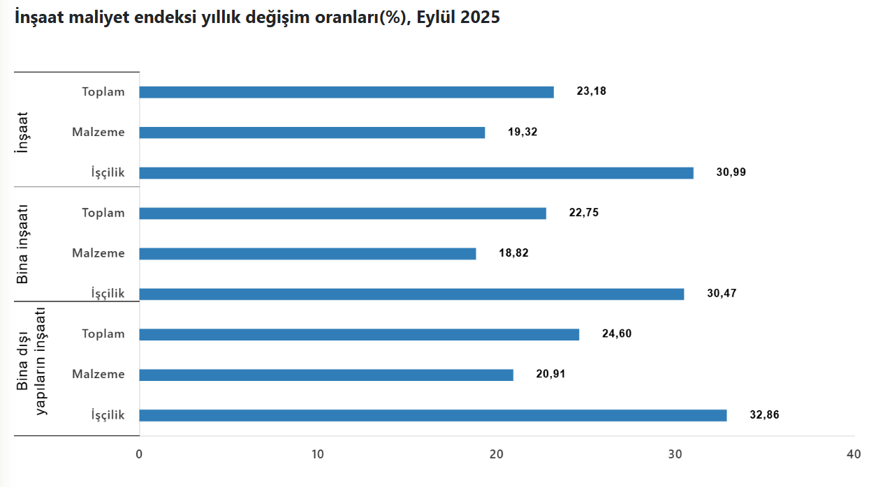 TÜİK verilerine göre inşaat maliyet endeksi, eylülde aylık bazda yüzde 0,87, yıllık bazda ise yüzde 23,18 artış gösterdi. Türkiye İstatistik Kurumu (TÜİK), Eylül 2025’e ilişkin inşaat maliyet endeksi verilerini açıkladı. İnşaat maliyet endeksi, 2025 yılı Eylül ayında bir önceki aya göre %0,87 arttı, bir önceki yılın aynı ayına göre %23,18 arttı. Bir önceki aya göre malzeme endeksi %0,90 arttı, işçilik endeksi %0,82 arttı. Ayrıca bir önceki yılın aynı ayına göre malzeme endeksi %19,32 arttı, işçilik endeksi %30,99 arttı. Bina inşaatı maliyeti Bina inşaatı maliyet endeksi, bir önceki aya göre %0,96 arttı, bir önceki yılın aynı ayına göre %22,75 arttı. Bir önceki aya göre malzeme endeksi %1,06 arttı, işçilik endeksi %0,80 arttı. Ayrıca bir önceki yılın aynı ayına göre malzeme endeksi %18,82 arttı, işçilik endeksi %30,47 arttı. Bina dışı yapıların maliyeti Bina dışı yapılar için inşaat maliyet endeksi, bir önceki aya göre %0,57 arttı, bir önceki yılın aynı ayına göre %24,60 arttı. Bir önceki aya göre malzeme endeksi %0,43 arttı, işçilik endeksi %0,87 arttı. Ayrıca bir önceki yılın aynı ayına göre malzeme endeksi %20,91 arttı, işçilik endeksi %32,86 arttı. Kaynak: TÜİK