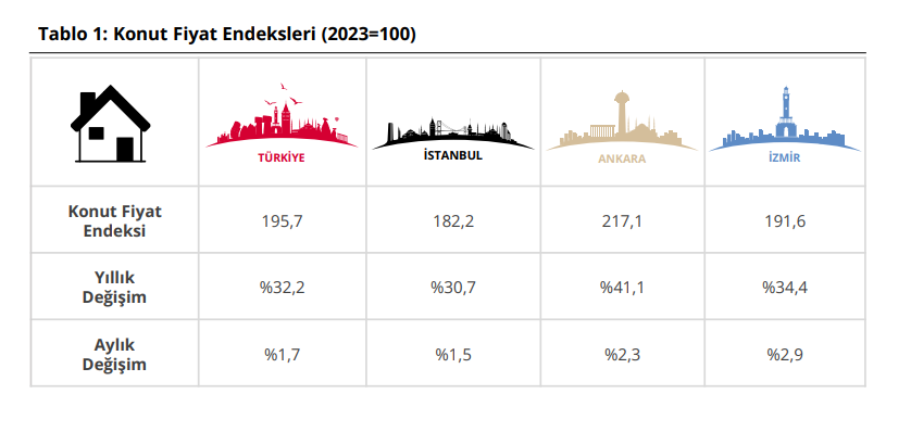 Merkez Bankası verilerine göre Konut Fiyat Endeksi (KFE) eylül ayında yıllık bazda yüzde 32,2 artış, reel olarak ise yüzde 0,8 azalış kaydetti. Türkiye Cumhuriyet Merkez Bankası tarafından Eylül 2025 dönemine ilişkin Konut Fiyat Endeksi verileri açıklandı. Türkiye'deki konutların kalite etkisinden arındırılmış fiyat değişimlerini izlemek amacıyla hesaplanan KFE (2023=100), eylül ayında bir önceki aya göre yüzde 1,7 artarak 195,7 oldu. Eylülde yıllık bazda yüzde 32,2 artan konut fiyatları, reel olarak yüzde 0,8 azalış kaydetti. Kaynak: Konut Fiyat Endeksi Üç büyük ilde fiyat değişimleri Üç büyük il için KFE değişimine bakıldığında eylül ayında bir önceki aya göre İstanbul'da yüzde 1,5, Ankara'da yüzde 2,3 ve İzmir'de yüzde 2,9 oranında artış görüldü. Endeks değerleri geçen yılın aynı ayına göre ise İstanbul'da yüzde 30,7, Ankara'da yüzde 41,1, İzmir'de yüzde 34,4 yükseliş kaydetti. Kaynak: Konut Fiyat Endeksi [news_id:788164] [news_id:788234]