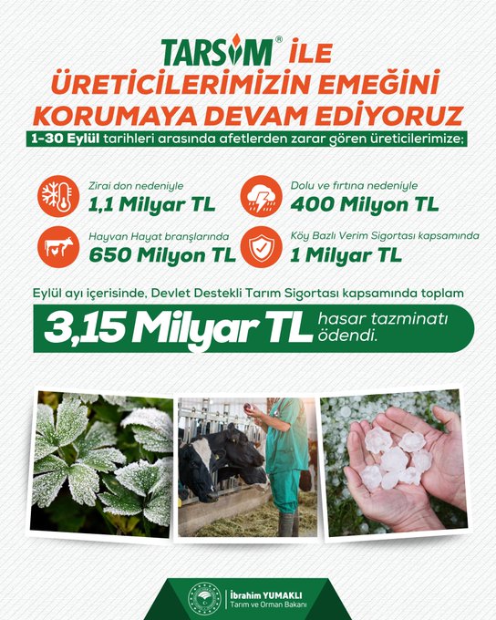 Tarım ve Orman Bakanı İbrahim Yumaklı, devlet destekli tarım sigortası kapsamında eylül ayında üreticilere 3 milyar 150 milyon lira hasar tazminatı ödendiğini bildirdi. Yumaklı, NSosyal'deki hesabından TARSİM'in hasar tazminatı ödemelerine ilişkin bilgi verdi. Doğal afetler ve riskler karşısında üreticinin emeğini koruduklarına işaret eden Yumaklı, "Eylül ayında devlet destekli tarım sigortası kapsamında üreticilerimize 3 milyar 150 milyon lira hasar tazminatı ödedik. TARSİM ile üreticimizin yanında olmaya, tarımın sigortası olmaya devam ediyoruz." ifadesini kullandı. Yumaklı'nın paylaşımında yer alan bilgilere göre, eylülde zirai don için 1,1 milyar lira, dolu ve fırtına için 400 milyon lira, hayvan hayat branşlarında 650 milyon lira ve köy bazlı verim sigortası kapsamında da 1 milyar lira ödeme yapıldı. Kaynak: İbrahim Yumaklı