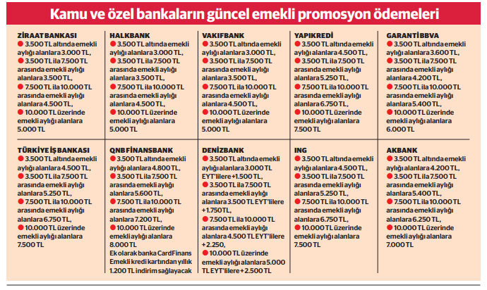 EYT'de ilk maaşların nisan ayında hesaplara yatacağının bildirilmesinin ardından bankalar promosyon yarışını hızlandırdı. Buna göre, şu anda yaklaşık 8 bin TL'ye ulaşan promosyon miktarlarının daha da yukarı çıkabileceği belirtiliyor. Dünya gazetesinden Birol Bozkurt'un haberine göre, bankalar 8 bin liraya kadar olan promosyonlarla ilgili çalışmalarını hızlandırdı. Kamu bankaları ve özel bankalar, banka promosyonları için çeşitli kampanyalar üzerinde çalışmaya başlarken ilk rakamlar da dillendirilmeye başlandı. EYT düzenlemesi sonrasında emeklilik hakkı elde eden vatandaşlar, ilk ödemelerini alacakları banka ve şubeyi e-Devlet'ten ya da emeklilik işlemleri sırasında SGK'dan seçebilecek. Böylece EYT'linin emekli maaşı, tercih ettiği bankaya yatırılacak. Kamu ve özel bankalar ayrıca emeklilere 3 yıl taahhüt ile kendi şubelerinden maaş almaları durumunda emekli promosyon ödemesi yapacak. Kaynak: Dünya Gazetesi EYT’den yararlanabilmek için prim ödemesi bulunan emekli adaylarına yönelik bankalar ayrıca kredi kampanyalarını da duyurmaya başladı. Buna göre, Akbank, SGK prim borcunu ödemek için Akbank EYT kredisi kullanacak müşterilerine yüzde 1,78’den başlayan faiz oranlarıyla kredi imkanı sağlıyor. Emekli maaşını Akbank’tan alanlara ise yaklaşık 8 bin 500 TL’ye varan promosyon fırsatı sunuyor. Garanti Bankası da EYT kredisi duyuran bankalar arasında. Banka tarafından yapılan açıklama SGK prim borcunu ödemek isteyenlerin krediden yararlanabileceği belirtildi. Garanti Bankası, EYT kredisi almak isteyenler 100 bin TL’ye kadar varan kredi seçenekleriyle krediden yararlanabilecek olan vatandaşların maksimum geri ödeme taksit tutarı 9 bin 667 TL oluyor. Kredilerde 50 bin TL’ye kadar olan seçeneklerde yüzde 2,54, 75 bin liraya kadar olan kredide faiz yüzde 1,91, 100 bin liraya kadar olan kredilerde faiz oranı yüzde 1,89 olarak belirlendi. Tıklayın: EYT'de banka promosyonları belli oldu: Hangi banka ne kadar verecek?