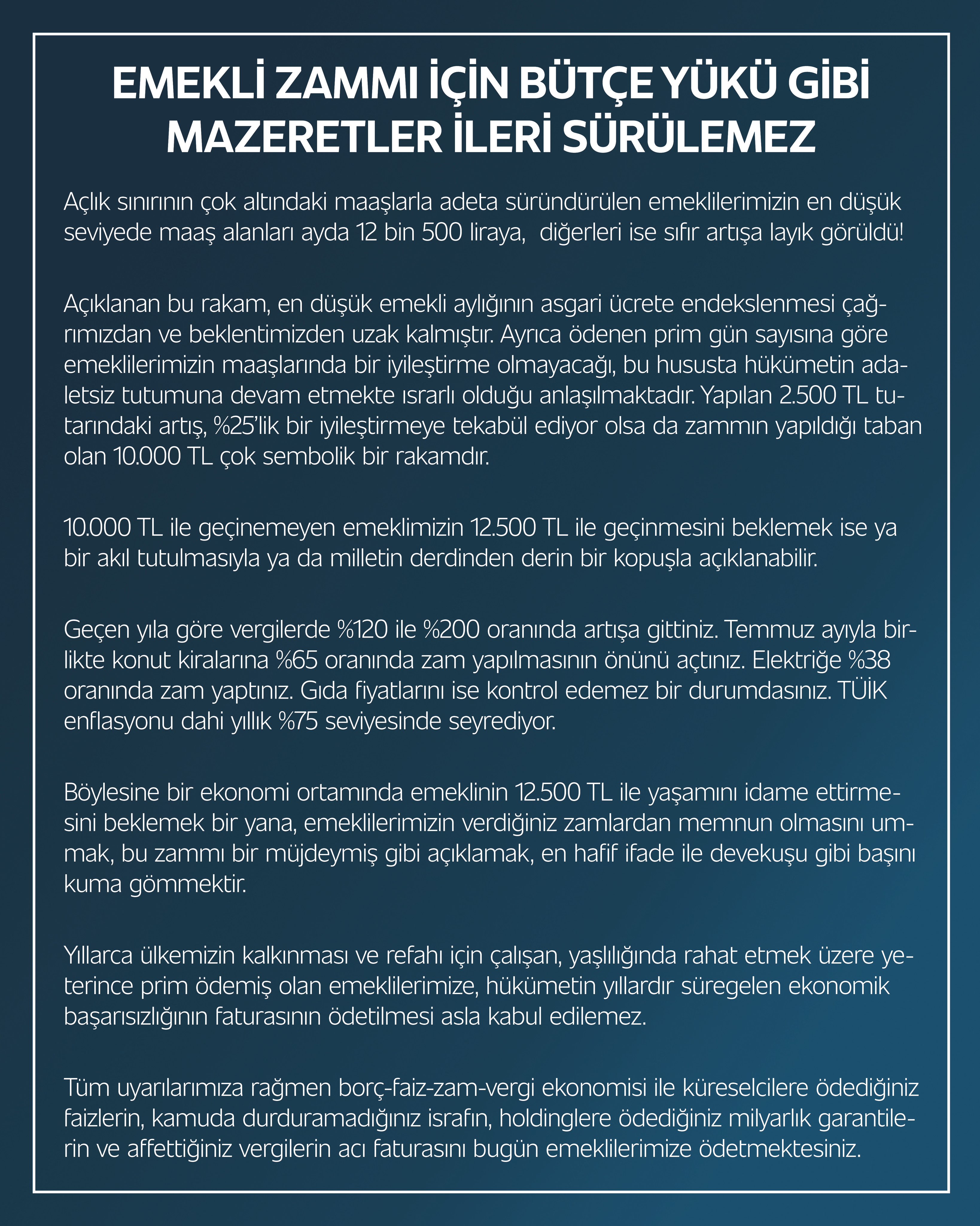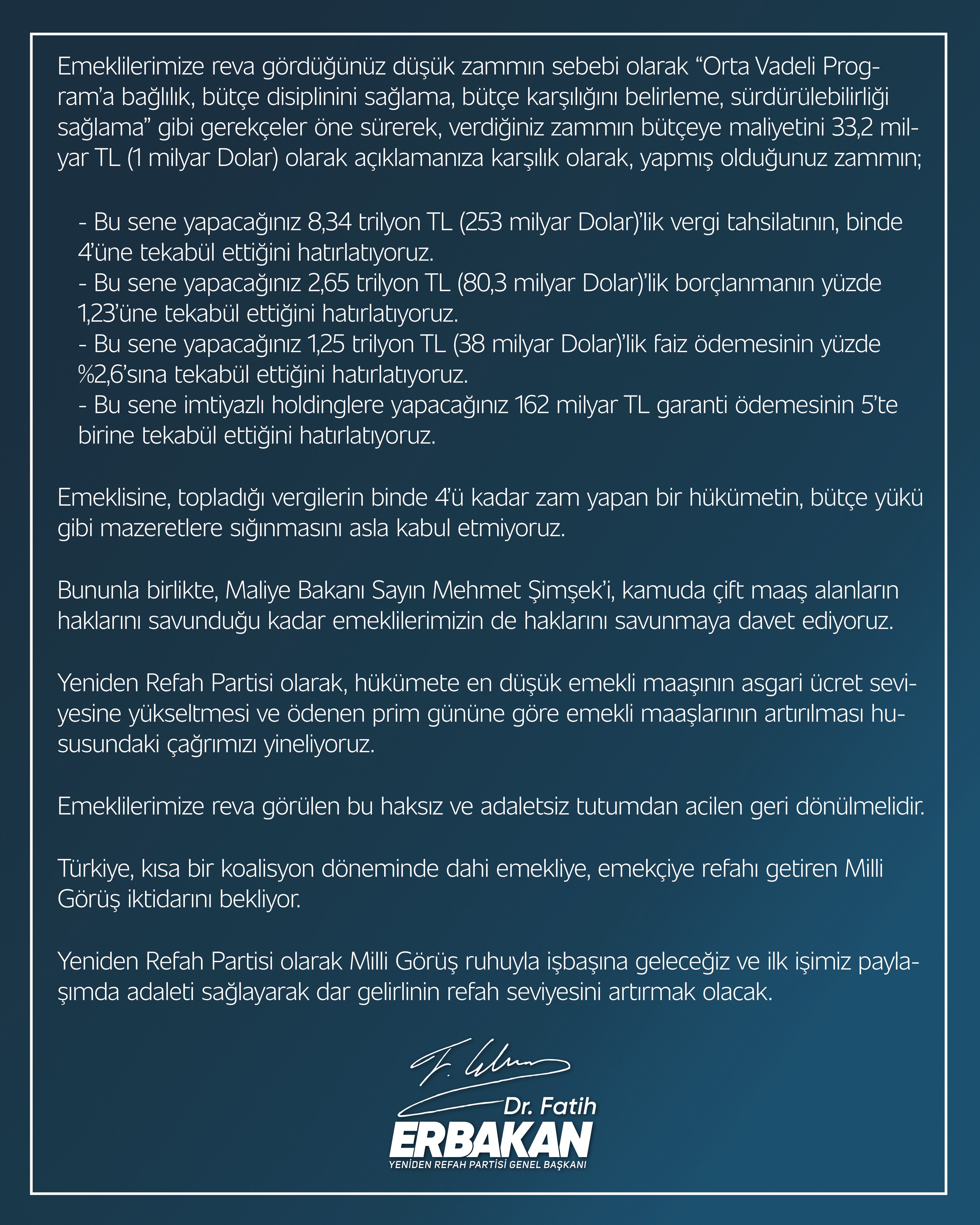Yeniden Refah Partisi Genel Başkanı Fatih Erbakan, emeklilere yapılan zammın yetersiz kaldığını belirterek, “Emeklisine, topladığı vergilerin binde 4’ü kadar zam yapan bir hükümetin, bütçe yükü gibi mazeretlere sığınmasını asla kabul etmiyoruz.” dedi. Yeniden Refah Partisi Genel Başkanı Erbakan'dan emekli zammına ilişkin açıklama yaptı. Buna göre Erbakan, sosyal medya hesabından yaptığı yazılı açıklamasında, geçinemeyen emeklinin, 12 bin 500 lirayla geçinmesinin de beklenemeyeceğini belirtti. Vergilerde yapılan artış ve zamların emeklilerin yaşamını daha da zorlaştırdığını savunan Fatih Erbakan, "Açıklanan bu rakam, en düşük emekli aylığının asgari ücrete endekslenmesi çağrımızdan ve beklentimizden uzak kalmıştır" değerlendirmesini yaptı. Emeklilerin yıllarca ülkenin kalkınması için çalıştığını ve yeterince prim ödediğini ifade eden Erbakan, şunları kaydetti: "Emeklilerimize, hükümetin yıllardır süregelen ekonomik başarısızlığının faturasının ödetilmesi asla kabul edilemez. Tüm uyarılarımıza rağmen borç-faiz-zam-vergi ekonomisi ile küreselcilere ödediğiniz faizlerin, kamuda durduramadığınız israfın, holdinglere ödediğiniz milyarlık garantilerin ve affettiğiniz vergilerin acı faturasını bugün emeklilerimize ödetmektesiniz." Kaynak: Fatih Erbakan - X Kaynak: Fatih Erbakan - X [news_id:739753]