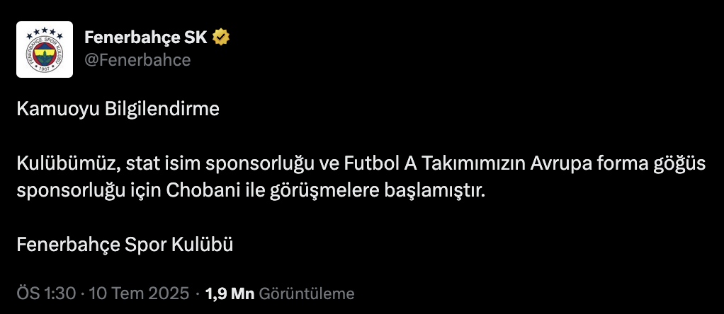 Fenerbahçe Kulübü, stadyum isim hakkı ve Futbol A Takımı'nın Avrupa kupalarındaki forma göğüs sponsorluğu için Amerika Birleşik Devletleri merkezli süt ürünleri markası Chobani ile masaya oturdu. Hamdi Ulukaya’nın sahibi olduğu şirketle yapılan müzakereler kamuoyuna resmen duyuruldu. Fenerbahçe Futbol AŞ, 10 Temmuz 2025 tarihinde Kamuyu Aydınlatma Platformu üzerinden yaptığı açıklamada, ABD merkezli gıda şirketi Chobani ile stat isim sponsorluğu ve Avrupa organizasyonlarında A takımın forma göğüs sponsorluğu için görüşmelere başlandığını bildirdi. Kamuya yapılan açıklamada, “Şirketimiz, stadyum isim sponsorluğu ve futbol A takımı Avrupa forma göğüs sponsorluğu için Chobani şirketi ile görüşmelere başlamıştır.” ifadeleri yer aldı. Söz konusu sponsorluk anlaşmasının tamamlanması halinde, sarı lacivertli kulübün stadyumu Chobani ismiyle anılabilecek ve Avrupa kupalarında giyilecek formalarda Chobani logosu yer alabilecek. Hamdi Ulukaya Etkisi: Taraftarlık ve Dostluk Anlaşmaya Zemin Hazırladı Amerika Birleşik Devletleri’nde yoğurt ve süt ürünleri üretimiyle tanınan Chobani markasının kurucusu olan Türk iş insanı Hamdi Ulukaya, yalnızca iş dünyasındaki başarılarıyla değil, aynı zamanda sosyal sorumluluk çalışmalarıyla da uluslararası alanda bilinen bir figür. Ulukaya’nın aynı zamanda koyu bir Fenerbahçe taraftarı olduğu, kulüp başkanı Ali Koç ile yakın dostluğu bulunduğu ve bu bağların söz konusu sponsorluk görüşmesinde belirleyici olduğu kulislerde konuşuldu. Kulüp kaynaklarından edinilen bilgiye göre, taraflar prensipte anlaşmaya vardı. Resmî rakamlar henüz açıklanmamış olsa da, kulislerde konuşulanlara göre anlaşmanın toplam tutarı 100 milyon Euro düzeyine ulaştı. Bu çerçevede Chobani’nin Fenerbahçe’ye yıllık yaklaşık 20 milyon Euro ödeme yapacağı belirtildi. Anlaşma Tamamlanırsa Neler Değişecek? Fenerbahçe’nin Chobani ile yürüttüğü görüşmelerin olumlu sonuçlanması durumunda, stat isminin değişmesi gündeme gelecek. Böylece Şükrü Saracoğlu Stadyumu, kulübün tarihindeki en yüksek meblağlı sponsorluklarından biriyle yeni bir isimle anılmaya başlanacak. Avrupa kupalarında forma üzerinde yer alacak olan Chobani logosu da, markanın uluslararası tanıtım stratejisi açısından dikkat çeken bir adım olacak.