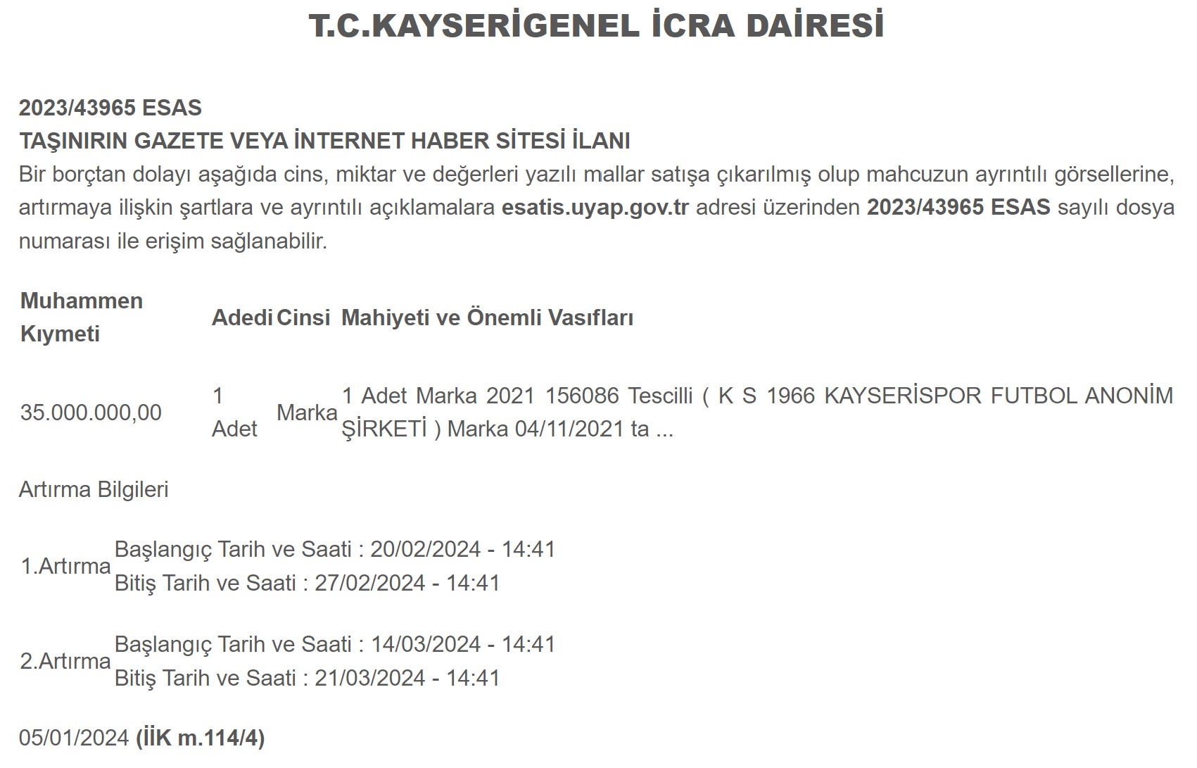 Son olarak FIFA'dan transfer yasağı alan Kayserispor icralık oldu. Süper Lig’de 7 takım ile birlikte yeni bir transfer yasağı gelen Kayserispor’da, maddi krizin derinliği artarken; Kayseri Genel İcra Dairesi’nden yapılan duyuruda, borçtan dolayı tescilli Kayserispor futbol anonim şirketi markasının icradan satılığa çıkarıldığı ifade edildi. Kulüp, mağaza ve futbol okulu 'Kayserispor Futbol Anonim Şirketi' ismi için belirlenen muhammen bedel ise 35 milyon TL oldu. 20 Şubat 2024 tarihinde saat 14.41’de başlayacak olan icra satışı, 27 Şubat saat 14.41’de sona erecek. Teklifler online olarak verilecek. Bu tarihler arasında satış gerçekleşmezse ikinci satış ihalesi 14 Mart’ta başlayacak ve 21 Mart tarihine kadar tekliflere açık olacak. Ayrıca Kayserispor Store ismi ile Kayserispor Futbol Okulları isimleri de satışa çıkarılacak. Kayserispor Store ismi için muhammen bedel 4 milyon TL olarak belirlenirken, Kayserispor Futbol Okulları ismi için ise muhammen bedel 8 milyon TL oldu. Kaynak: ilan.gov.tr