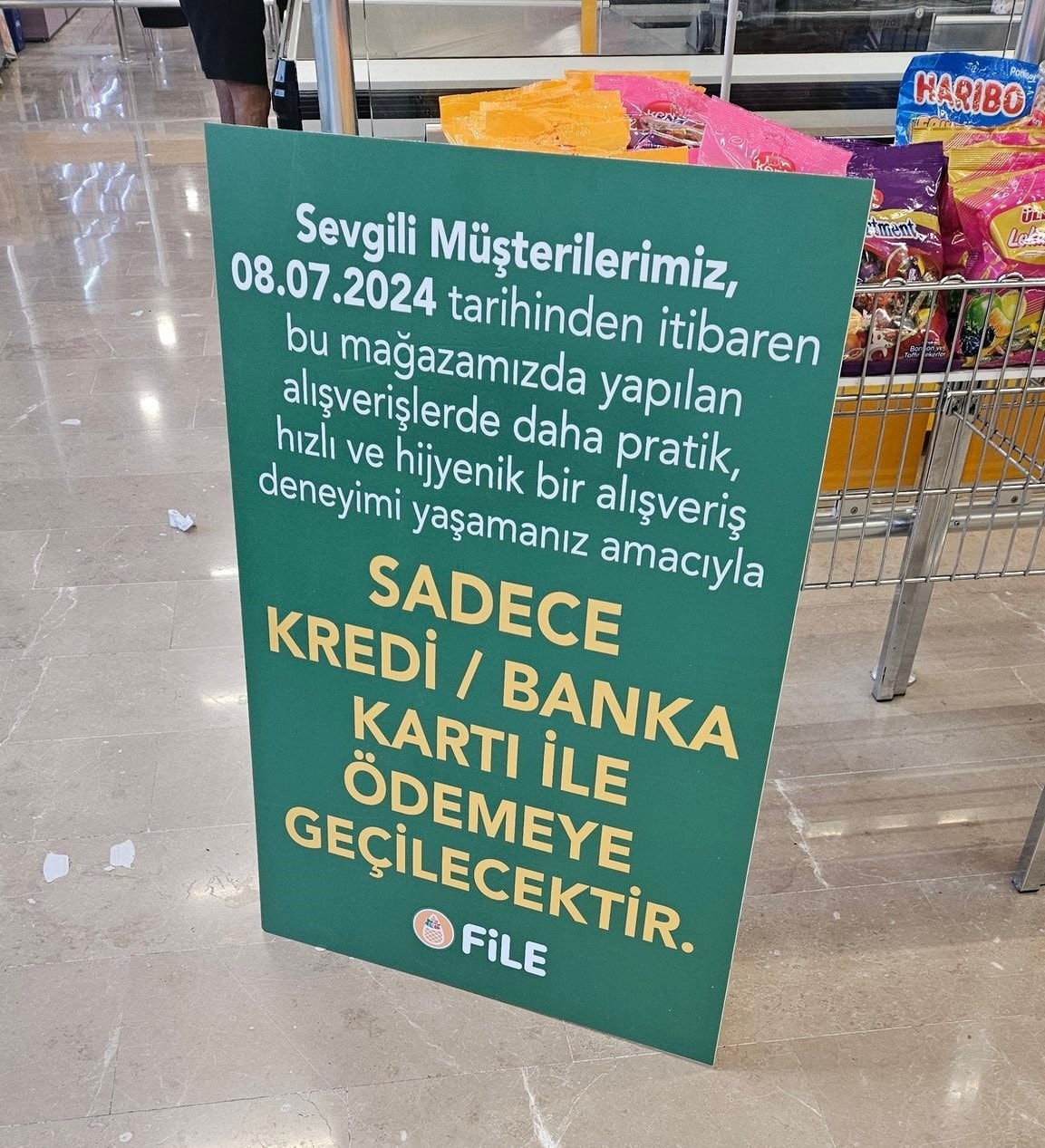 BİM bünyesinde bulunan File mağazalarının bazılarında sadece kartlı ödeme yapılacağı bildirildi. Sosyal medyada File Market'te bulunan duyuru kısa sürede yayıldı. Buna göre BİM bünyesinde bulunan bazı File Market mağazalarında nakit ödeme yönteminin kaldırıldığı ve sadece kartlı ödeme yapılacağı bildirildi. Duyuruda ise şunlar aktarıldı: "Sevgili müşterilerimiz 08.07.2024 tarihinden itibaren bu mağazamızda yapılan alışverişlerde daha pratik, hızlı ve hijyenik bir alışveriş deneyimi yaşamanız amacıyla sadece kredi/banka kartları ile ödemeye geçilecektir." Tepki toplayan karara itiraz ise Tüketici Konfedarasyonundan geldi. Tüketici Konfedarasyonu sosyal medya üzerinden yaptığı açıklamada tepkilerini şu sözlerle dile getirdi: “BİM'in gurme market markası File temmuz ayından itibaren nakitsiz toplum/markete geçiş yapıyor. Artık nakit ile ödeme kabul edilmeyecek. Bu hakkı hiçe sayan iş yerlerinden alışverişi kesin. File senin böyle bir zorlama hakkın yok. Vazgeçin bu uygulamadan, tüketiciyi karşınıza almayın.'' [news_id:730703]