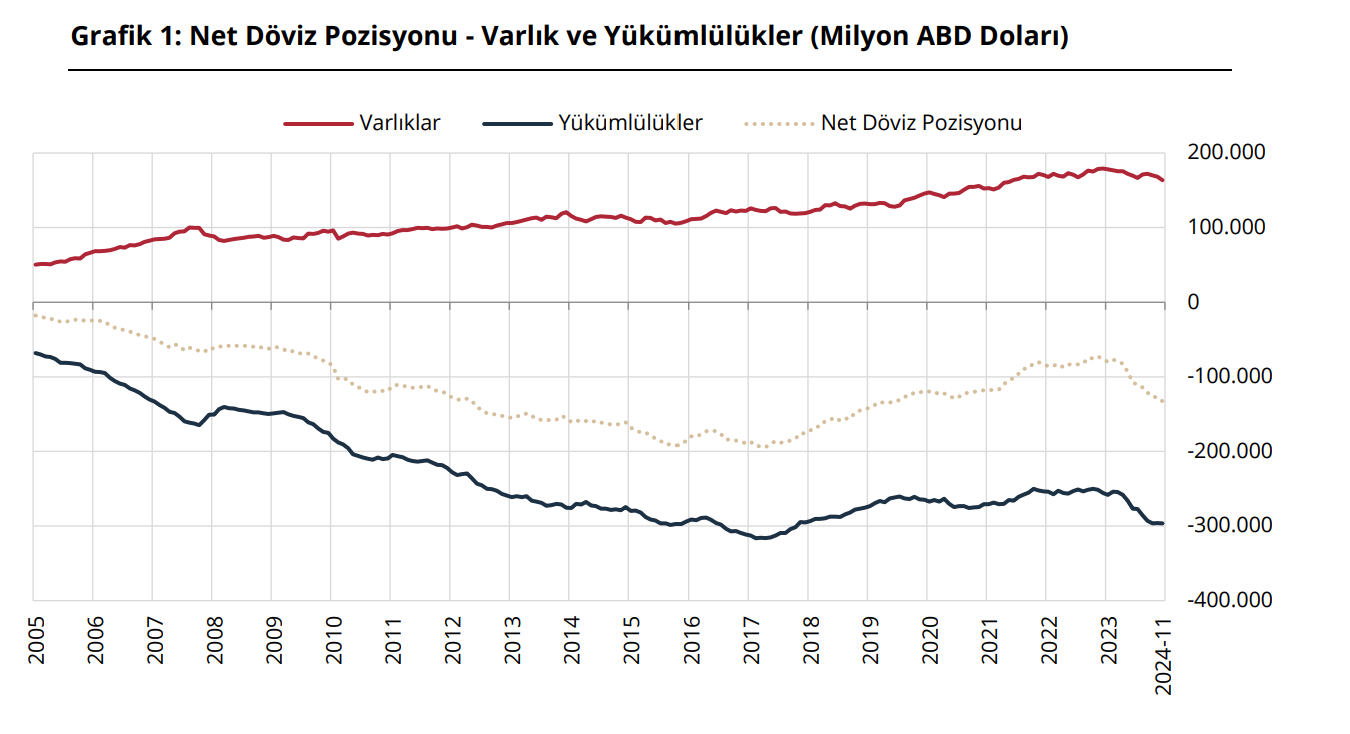 Finans dışındaki sektörlerin net döviz açığı, 2024 yılının kasım ayında 132 milyar 798 milyon dolara yükseldi. Türkiye Cumhuriyet Merkez Bankası (TCMB) verilerine göre, kasım ayında finansal kesim dışındaki firmaların döviz varlıkları bir önceki aya kıyasla 4 milyar 942 milyon dolar azalırken, yükümlülükleri ise 181 milyon dolar arttı. Bu durum, söz konusu firmaların net döviz pozisyonu açığının 5 milyar 123 milyon dolar artmasına ve 132 milyar 798 milyon dolara ulaşmasına yol açtı. Varlık dağılımı incelendiğinde, bir önceki aya göre yurt içi bankalardaki mevduat 4 milyar 623 milyon dolar, ihracat alacakları 775 milyon dolar ve menkul kıymetler 83 milyon dolar azaldı. Buna karşılık, yurt dışına doğrudan sermaye yatırımları 540 milyon dolar artış kaydetti. Yükümlülük dağılımında ise kasım ayında yurt içinden sağlanan nakdi krediler 1 milyar 955 milyon dolar artarken, yurt dışından sağlanan nakdi krediler 1 milyar 582 milyon dolar ve ithalat borçları 192 milyon dolar azaldı. Yükümlülüklerin vade yapısına bakıldığında, kasım ayında yurt içinden sağlanan kısa vadeli krediler bir önceki aya kıyasla 631 milyon dolar arttı. Yurt dışından sağlanan kredilerde kısa vadeli olanlar 1 milyar 648 milyon dolar, uzun vadeli krediler ise 127 milyon dolar geriledi. Kasım 2024 döneminde kısa vadeli varlıklar 133 milyar 756 milyon dolar olarak gerçekleşirken, kısa vadeli yükümlülükler 109 milyar 294 milyon dolar oldu. Kısa vadeli net döviz pozisyonu fazlası, kasım ayında bir önceki aya göre 4 milyar 465 milyon dolar azalarak 24 milyar 461 milyon dolara geriledi. Kısa vadeli yükümlülüklerin toplam yükümlülükler içindeki payı ise yüzde 37 olarak kaydedildi.