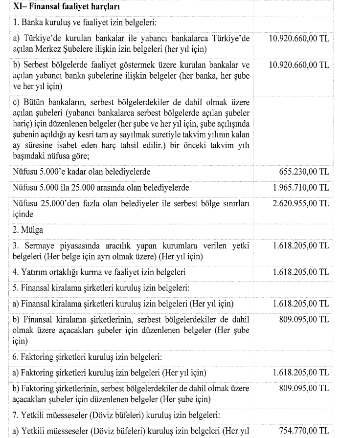 Finansal faaliyetlere ilişkin işlemlerde uygulanacak maktu harç tutarları belli oldu. Resmi Gazete'de yayımlanarak yürürlüğe giren karara göre Harçlar Kanunu'na bağlı tarifelerde yer alan maktu harç tutarları yeniden belirlendi. Türkiye'de kurulan bankalar ile yabancı bankalarca Türkiye'de açılan merkez şubelere (her yıl için) ve serbest bölgelerde faaliyet göstermek üzere kurulan bankalar ve açılan yabancı banka şubelerine (her banka, şube ve her yıl için) ilişkin izin belgeleri için tutar 10 milyon 920 bin 660 lira oldu. Bütün bankaların, serbest bölgelerdekiler de dahil olmak üzere açılan şubeleri için düzenlenen belgeler, nüfusu 5 bine kadar olan belediyelerde 655 bin 230 lira, nüfusu 5 bin ila 25 bin arasında olan belediyelerde 1 milyon 965 bin 710 lira, nüfusu 25 binden fazla olan belediyeler ile serbest bölge sınırları içinde 2 milyon 620 bin 955 lira olarak belirlendi. Sermaye piyasasında aracılık yapan kurumlara verilen yetki belgeleri, yatırım ortaklığı kurma ve faaliyet izin belgeleri ve finansal kiralama şirketleri kuruluş izin belgeleri için harç tutarı 1 milyon 618 bin 205 lira oldu. Öte yandan sigorta şirketi kuruluşu için 4 milyon 45 bin 580 liralık, emeklilik şirketi içinse 2 milyon 847 bin 530 liralık tutar belirlendi. Diğer finansal kurumların kuruluş ve faaliyet izin belgeleri için ise söz konusu tutar ise 1 milyon 618 bin 205 lira oldu. [news_id:783998]