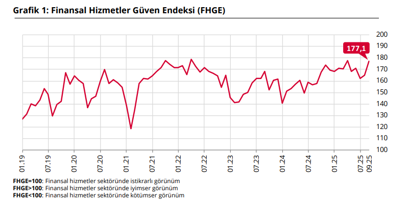 Finansal Hizmetler Güven Endeksi (FHGE), eylülde geçen aya göre 12,3 puan artarak 177,1 seviyesine çıktı. Türkiye Cumhuriyet Merkez Bankası, eylül ayına ilişkin Finansal Hizmetler İstatistikleri ve Finansal Hizmetler Güven Endeksi'ni açıkladı. Finansal sektörde faaliyet gösteren 147 kuruluşun yanıtlarının ağırlıklandırılıp toplulaştırılmasıyla elde edilen anket sonuçlarına göre FHGE, eylülde geçen aya göre 12,3 puan artarak 177,1 değerini aldı. Endeksi oluşturan anket sorularına ait yayılma endeksleri incelendiğinde, son 3 aydaki iş durumu, son 3 ayda hizmetlere olan talep ile gelecek 3 ayda hizmetlere talep beklentisi olmak üzere tüm alt endekslerin FHGE'yi artış yönünde etkilediği görüldü. İş durumu ve hizmetlere olan talebe ilişkin değerlendirmelere göre, son 3 ayda iş durumunda iyileşme olduğu yönündeki değerlendirmelerin bir önceki aya kıyasla güçlendiği gözlendi. Son 3 ayda hizmetlere olan talepte artış gerçekleştiği yönündeki değerlendirmeler ile gelecek 3 ayda hizmetlere olan talepte artış olacağı beklentilerinin de güçlendiği görüldü. İstihdama ilişkin değerlendirmelere göre, son 3 ayda istihdamda artış olduğunu bildirenler ile gelecek 3 ayda istihdamda artış olmasını bekleyenler lehine seyrin zayıfladığı gözlendi. 2025 yılı eylül ayında NACE Rev.2 sektör sınıflamasına göre "Finans ve Sigorta Faaliyetleri" sektöründe güven endeksleri alt sektörler itibarıyla değerlendirildiğinde, bir önceki aya göre "64-Finansal Hizmet Faaliyetleri (sigorta ve emeklilik fonları hariç)", "65-Sigorta, Reasürans ve Emeklilik Fonları (zorunlu sosyal güvenlik hizmetleri hariç)" ve "66-Finansal Hizmetler ile Sigorta Faaliyetleri için Yardımcı Faaliyetler" sektörlerinde sırasıyla 13,3, 0,1 ve 2,7 puanlık artış olduğu görüldü.