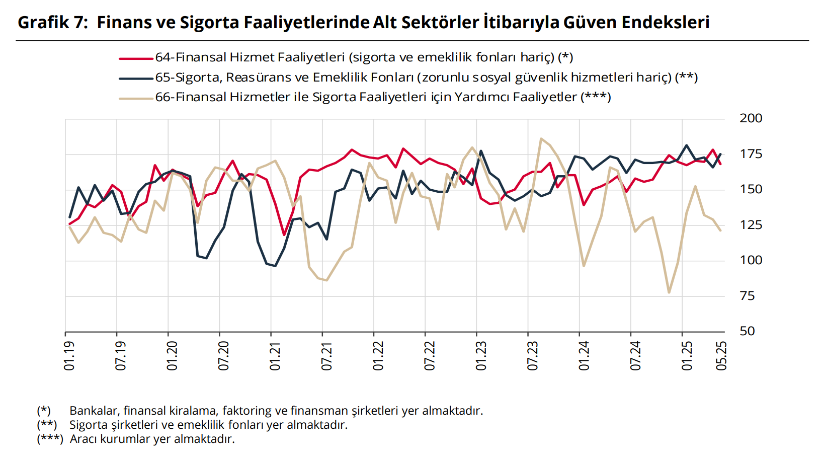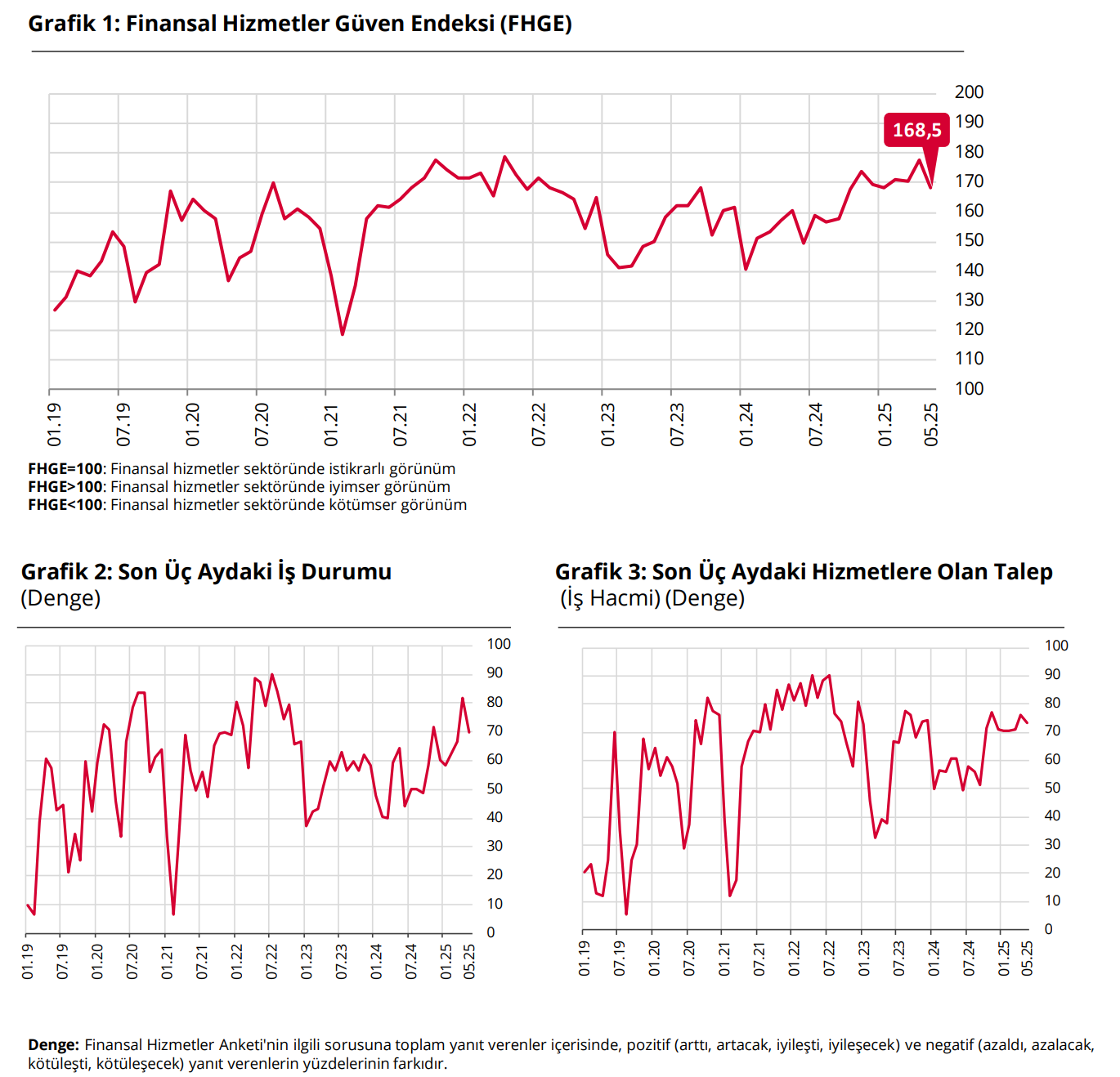 Finansal Hizmetler Güven Endeksi (FHGE), mayısta geçen aya göre 9,2 puan azalışla 168,5'e düştü. Türkiye Cumhuriyet Merkez Bankası (TCMB), mayıs ayına ilişkin Finansal Hizmetler İstatistikleri ve Finansal Hizmetler Güven Endeksi'ni açıkladı. Buna göre 2025 yılı Mayıs ayında FHGE, bir önceki aya göre 9,2 puan azalış kaydederek 168,5 seviyesinde gerçekleşti. Endeksi oluşturan anket sorularına ait yayılma endeksleri incelendiğinde, gelecek üç aydaki hizmetlere olan talep beklentisi, son üç aydaki iş durumu ile son üç aydaki hizmetlere olan talep olmak üzere tüm alt endekslerin FHGE’yi azalış yönünde etkilediği görüldü. Kaynak: TCMB İş durumu ve hizmetlere olan talebe ilişkin değerlendirmelere göre, son üç ayda iş durumunda iyileşme olduğu yönündeki değerlendirmelerin bir önceki aya göre zayıfladığı gözlendi. Son üç ayda hizmetlere olan talepte artış olduğu yönündeki değerlendirmeler ile gelecek üç ayda hizmetlere olan talepte artış olacağı yönündeki beklentilerin de bir önceki aya göre zayıfladığı görüldü. İstihdama ilişkin değerlendirmelere göre son üç ayda istihdamda artış olduğunu bildirenler ile gelecek üç ayda istihdamda artış olacağını bekleyenler lehine olan seyrin güçlendiği gözlendi. 2025 yılı Mayıs ayında, NACE Rev.2 sektör sınıflamasına göre "Finans ve Sigorta Faaliyetleri" sektöründe güven endeksleri alt sektörler itibarıyla değerlendirildiğinde, bir önceki aya göre “64-Finansal Hizmet Faaliyetleri (sigorta ve emeklilik fonları hariç)” ve "66-Finansal Hizmetler ile Sigorta Faaliyetleri için Yardımcı Faaliyetler“ sektörlerinde sırasıyla 10,4 ve 7,6 puanlık azalış, "65-Sigorta, Reasürans ve Emeklilik Fonları (zorunlu sosyal güvenlik hizmetleri hariç)“ sektöründe ise 8,8 puanlık artış olduğu tespit edildi. Kaynak: TCMB