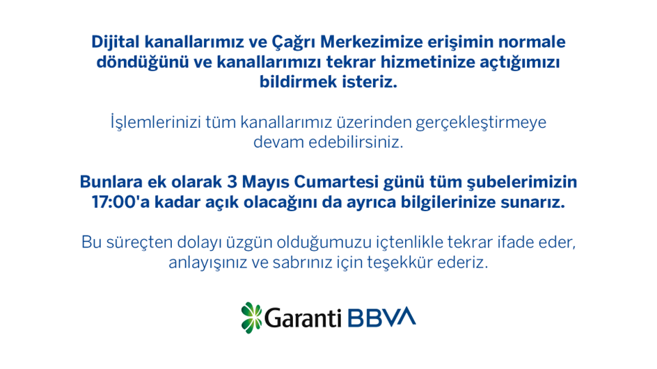 Garanti BBVA, dün yaşanan erişim sorunlarının giderildiğini ve şubelerin 3 Mayıs Cumartesi günü 17.00’ye kadar açık olacağını duyurdu. Dün sistemlerinde sorun yaşanan ve uygulamalarına erişilemeyen Garanti BBVA’da sorun çözüldü. Bankadan yapılan açıklamalarda yaşanan sorunun teknik aksaklık olduğu belirtilirken, yaşanan aksaklıklar nedeniyle dün gece 00.00’a kadar açık olan şubelerin, bugün de (3 Mayıs Cumartesi) 17.00’ye kadar açık kalacağı belirtildi. Garanti BBVA’dan yapılan son açıklama şu şekilde oldu: "Değerli Müşterilerimiz, Dijital kanallarımız ve Çağrı Merkezimize erişimin normale döndüğünü ve kanallarımızı tekrar hizmetinize açtığımızı bildirmek isteriz. İşlemlerinizi tüm kanallarımız üzerinden gerçekleştirmeye devam edebilirsiniz. Bunlara ek olarak 3 Mayıs Cumartesi günü tüm şubelerimizin 17:00'a kadar açık olacağını da ayrıca bilgilerinize sunarız. Bu süreçten dolayı üzgün olduğumuzu içtenlikle tekrar ifade eder, anlayışınız ve sabrınız için teşekkür ederiz.” Kaynak: Garanti BBVA [news_id:770824]