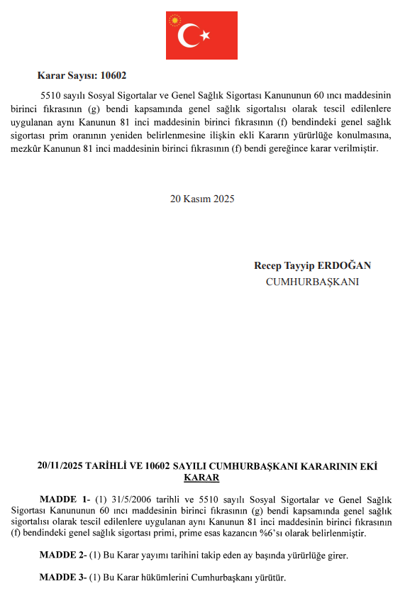 Genel Sağlık Sigortası'ndaki (GSS) prim oranı artırıldı. Daha önce brüt asgari ücretin yüzde 3'ü olarak belirlenen GSS primi artık yüzde 6'sı olarak hesaplanacak. Genel Sağlık Sigortası'nda (GSS) prim oranı, prime esas kazancın yüzde 3'ünden yüzde 6'sı oranına çıkarıldı. İlgili Cumhurbaşkanı kararı Resmi Gazete'nin bugünkü sayısında yayımlanarak yürürlüğe girdi. Resmi Gazete'de yer alan düzenlemeye göre mevcut durumda 780,17 TL olan GSS primi aralık ayı başından itibaren 1560,34 TL olarak uygulanacak. 1 Ocak 2026’da asgari ücrete yapılacak zamla birlikte GSS primi bir kez daha artış gösterecek. Kaynak: Resmi Gazete Genel Sağlık Sigortası nedir? Sosyal Sigortalar ve Genel Sağlık Sigortası Kanunu kapsamında yürürlüğe giren GSS; Türkiye Cumhuriyeti vatandaşlarının sağlık hizmetlerinden yararlanmasını amaçlar. Genel sağlık sigortası ile ilgili en önemli detay, herhangi bir sağlık sigortası bulunmayan vatandaşların da sigortalı olanlar gibi hizmet almasını sağlamasıdır. GSS ile vatandaşların ekonomik gücüne bakılmaksızın, herhangi bir hastalık durumunda toplumdaki herkesin sağlık hizmetlerinden eşit bir şekilde faydalanması amaçlanır. Devlet memurları ve çalışanların da dahil olduğu sigorta sistemi GSS olarak kabul edilir. Ancak çalışanların sigorta primleri işveren tarafından ödendiği için otomatik olarak sigortalı sayılırlar. Çalışanların devlet hastanelerinde belirli koşullar dahilinde ücretsiz muayene ve tedavi hakları bulunur. Genel sağlık sigortası sayesinde çalışmayan vatandaşlar da muayene ve tedavi hakkına sahip olur. [news_id:792199]