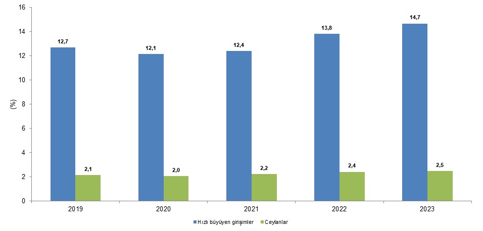 TÜİK verilerine göre 2023 yılında yeni girişim sayısı bir önceki yıla göre 44 bin azalarak 575 bin 951 oldu. Bu rakam ise yeni kurulan girişimlerde son iki yılın en zayıf karnesine işaret etti. Türkiye İstatistik Kurumu, 'Girişimcilik ve İş Demografisi 2023 verilerini açıkladı. Açıklanan verilere göre, girişimlerin 2022 yılındaki doğum oranı yüzde 16,1 düzeyindeyken 2023 yılında bu oran yüzde 15,2 oldu. Söz konusu girişimlerin istihdamdaki payı 2022 yılıda yüzde 5,5 iken, 2023 yılında yüzde 5'e düştü. Veriler, yeni girişim sayılarının pandeminin etkin oluğu 2021 yılından daha geri olduğunu gösterdi. 2021 yılında yeni doğana girişim sayısı 581 bin 535 ve 2022 yılında 619 bin 796 olurken söz konusu veri geçen yıl 575 bin 951 olarak gerçekleşti. Doğan girişimler incelendiğinde, 2023 yılında en yüksek payı yüzde 33,5 ile toptan ve perakende ticaret; motorlu kara taşıtlarının ve motosikletlerin onarımı sektörü aldı. Bu sektörü sırasıyla, yüzde 17,9 ile ulaştırma ve depolama ve yüzde 10,1 ile imalat sektörleri takip etti. En yüksek pay İstanbul'un 2023'te doğan girişimlerden en yüksek payı İstanbul aldı. İstanbul'u sırasıyla yüzde 7,9 ile Ankara ve yüzde 6,6 ile İzmir takip etti. Kaynak: TÜİK 2022 yılında doğan girişimlerin yüzde 75,5'i 2023'te hayatta kaldı Girişimlerin 2021 yılında bir yıllık hayatta kalma oranı yüzde 75,3, iki yıllık hayatta kalma oranı yüzde 56,7 olarak gerçekleşti. Üç yıllık hayatta kalma oranı yüzde 55,3, dört yıllık hayatta kalma oranı yüzde 49,2 olurken beş yıllık hayatta kalma oranı yüzde 41,6 oldu. Hızlı büyüyen girişimler imalat sektöründe Hızlı büyüyen girişimlerin 2023 yılında yüzde 26,6'sı imalat, yüzde 19,9'u toptan ve perakende ticaret; motorlu kara taşıtlarının ve motosikletlerin onarımı ve yüzde 14,7'si ise inşaat sektöründe faaliyet gösterdi. Kaynak: TÜİK Ceylan girişimlerin 2023 yılında yüzde 25,7'si imalat, yüzde 14,3'ü toptan ve perakende ticaret; motorlu kara taşıtlarının ve motosikletlerin onarımı yüzde 12,4'ü ise inşaat sektöründe faaliyet gösterdi. İmalat sanayinde 2023 yılında doğan girişimlerin yüzde 57,7'si düşük teknoloji ürünleri üretti İmalat sanayinde 2023 yılında doğan girişimlerin yüzde 29,1'i orta düşük, yüzde 12,2'si orta yüksek, yüzde 1,0'ı ise yüksek teknoloji düzeyine sahip ürünleri üreten girişimler oldu. [news_id:755736]