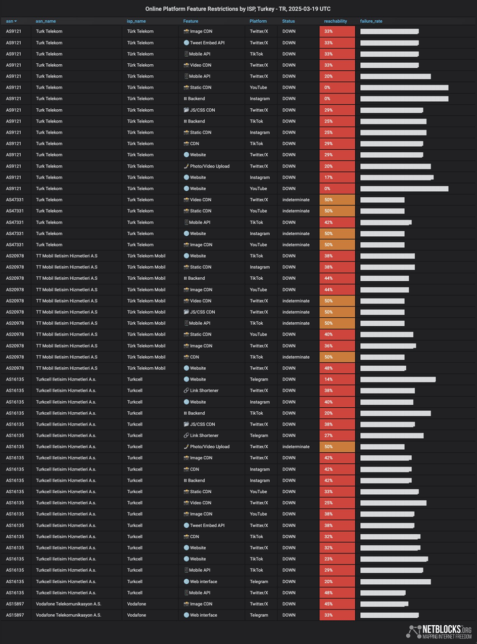 Ekrem İmamoğlu’nun gözaltına alınması sonrasında Türkiye'de sosyal medya platformlarına erişimde yavaşlamalar yaşandı. İstanbul Büyükşehir Belediyesi'ne (İBB) yönelik başlatılan soruşturma kapsamında aralarında İBB Başkanı Ekrem İmamoğlu ve aralarında basın danışmanı Murat Ongun'un da bulunduğu çok sayıda isim hakkında gözaltı kararı alındı. Gözaltı kararı sonrasında İstanbul Valiliği, 19-23 Mart tarihleri arasında kentte tüm gösteri ve basın açıklamalarını yasaklayarak katı önlemler aldı. Açıklamada, “İstanbul’da huzur ve güven ortamını korumak amacıyla, belirtilen tarihler arasında herhangi bir toplantı, yürüyüş ve basın açıklaması yapılmasına izin verilmeyecektir” ifadelerine yer verildi. Yaşanan gelişmelerin ortasında Türkiye'de sosyal medya hesaplarında da erişimde yavaşlamalar yaşandı. NetBlocks verilerine göre canlı ölçümler Türkiye'de X, YouTube, Instagram ve TikTok dahil olmak üzere birçok sosyal medya platformunda erişim kısıtlaması yaşandığını gösterdi. Kaynak: NetBlocks Kesintileri takip eden web sitesi downdetector verileri de Türkiye'de sabah saatlerinde kullanıcıların erişim sorunu raporlarının arttığını teyit etti. Kaynak: Downdetector [news_id:766253] [news_id:766255]