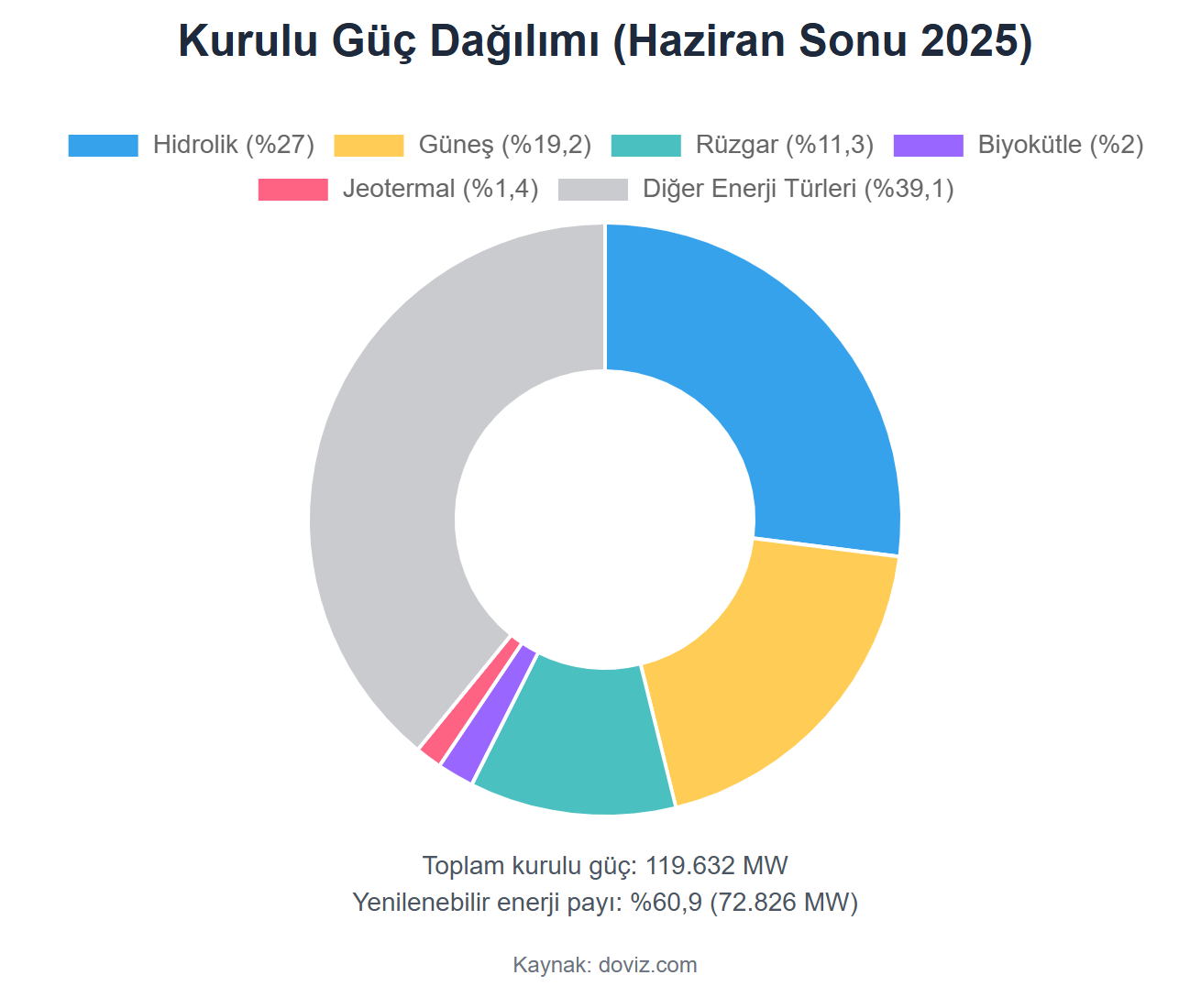 Haziran ayında güneş ve rüzgar enerjisinden üretilen toplam elektrik miktarı 8,4 milyar kilovatsaate ulaşarak aylık bazda tüm zamanların en yüksek seviyesine çıktı. Haziran sonu itibarıyla Türkiye’nin toplam elektrik kurulu gücü 119 bin 632 megavata ulaşırken, bunun yüzde 60,9’unu oluşturan 72 bin 826 megavatlık kısmı yenilenebilir enerji kaynaklarından oluştu. Yenilenebilir kaynaklar içerisinde en büyük payı 32 bin 291 megavat ile hidroelektrik santraller alırken, güneş enerjisinin kurulu güçteki payı 22 bin 937 megavat ile yüzde 19,2’ye, rüzgar enerjisinin payı ise 13 bin 465 megavatla yüzde 11,3’e yükseldi. Bu oranlar, güneş ve rüzgar için oransal bazda bugüne kadar ulaşılan en yüksek seviyeler olarak kayıtlara geçti. Biyokütle santrallerinin kurulu güçteki payı 2 bin 399 megavatla yüzde 2, jeotermal kaynaklı kurulu güç ise bin 734 megavatla yüzde 1,4 seviyesinde gerçekleşti. Üretimde yenilenebilir payı yüzde 52,5’ye ulaştı Haziran ayında Türkiye’nin toplam elektrik üretimi 28,38 milyar kilovatsaat olarak gerçekleşti. Bu üretimin 18,4 milyar kilovatsaatlik bölümü yerli kaynaklara, 14,9 milyar kilovatsaatlik bölümü ise yenilenebilir enerji kaynaklarına dayalı olarak üretildi. Böylece, yenilenebilir enerji kaynaklarından sağlanan elektrik üretimi toplam üretimin yüzde 52,5’ine karşılık geldi. Rüzgar ve güneşten üretilen toplam 8,4 milyar kilovatsaatlik elektrik, yüzde 29,6’lık payla tüm zamanların en yüksek aylık oranına ulaşırken, güneşten tek başına elde edilen 4,6 milyar kilovatsaatlik üretim de yüzde 16,1 oranıyla rekor seviyeye çıktı. [news_id:779577]