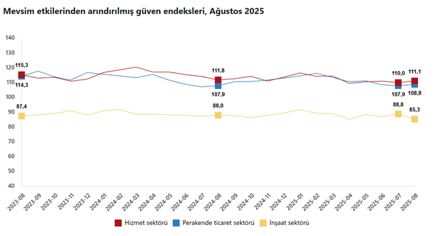TÜİK verilerine göre hizmet sektöründe %1,1 ve perakende ticaret sektöründe yüzde 0,8 artan güven endeksi, inşaat sektöründe %4 azaldı. Türkiye İstatistik Kurumu, ağustos ayına ilişkin hizmet, perakende ticaret ve inşaat güven endekslerini açıkladı. Güven endeksi hizmet sektöründe %1,1 arttı, perakende ticaret sektöründe %0,8 arttı, inşaat sektöründe %4,0 azaldı. Mevsim etkilerinden arındırılmış güven endeksi Ağustos ayında bir önceki aya göre; hizmet sektöründe %1,1 oranında artarak 111,1 değerini, perakende ticaret sektöründe %0,8 oranında artarak 108,8 değerini ve inşaat sektöründe %4,0 oranında azalarak 85,3 değerini aldı.
